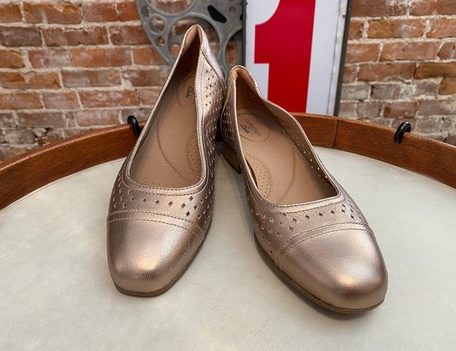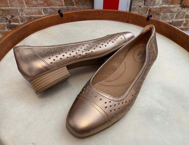 Clarks Metallic Perforated Leather Pumps Juliet Cedar New Loafer Ballet Description CLARKS Need a little work-look balance? Pumps with some airy perforation and a low walkable heel make the best officemates. From Clarks Footwear. The features are: Brand new in a plain new shoe box Style: Juliet Cedar Leather upper, punched detailing OrthoLite footbed, textured outsole Bottom: Juliet Approximately 1"H stacked heel Leather upper; man-made balance Information provided by Clarks. Be sure to check out my EBAY STORE. Enjoy! Payment, Shipping & Return Information U.S. Buyers to pay shipping and handling of 6.95 for 1st item. For each additional item add 6.95 . For shipping discount to apply, all items need to paid in one combined payment. Missouri Residents to pay Sales Tax Items may returned in original condition for a refund of the purchase price. Shipping costs will not be refunded, unless an error was made by us. International Shipping rates: Canada via 1st class international: 16.95 Worldwide via 1st class international: 21.95 For Multiple item shipping discounts, Priority Mail or Express Mail International please contact me for a shipping Quote International Buyers - Please note: Import duties, taxes and charges are not included in the item price or shipping charges. These charges are the buyer's responsibility. Please check with your country's customs office to determine what these additional costs will be prior to bidding/buying. Due to the USPS raising international shipping costs, I may have to package without the shoeboxes for some International Shipments. We accept Paypal. Thanks for Looking.