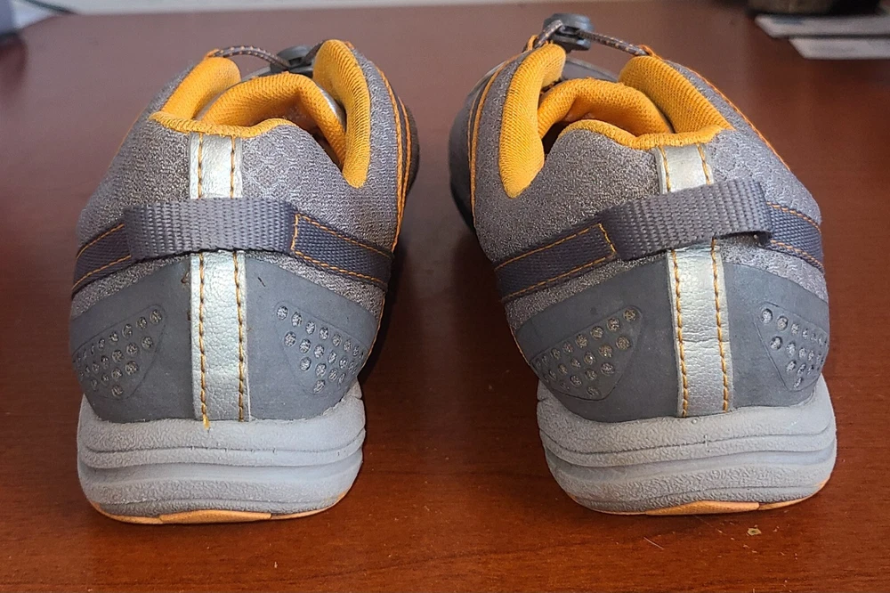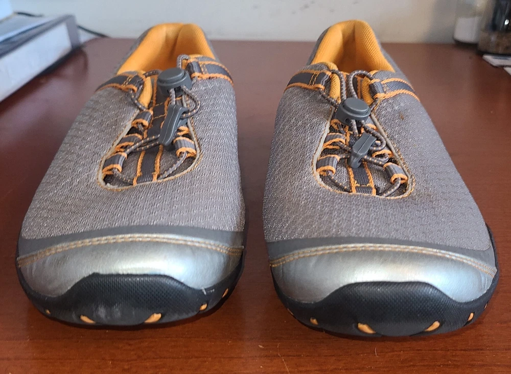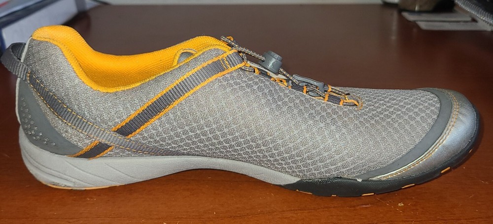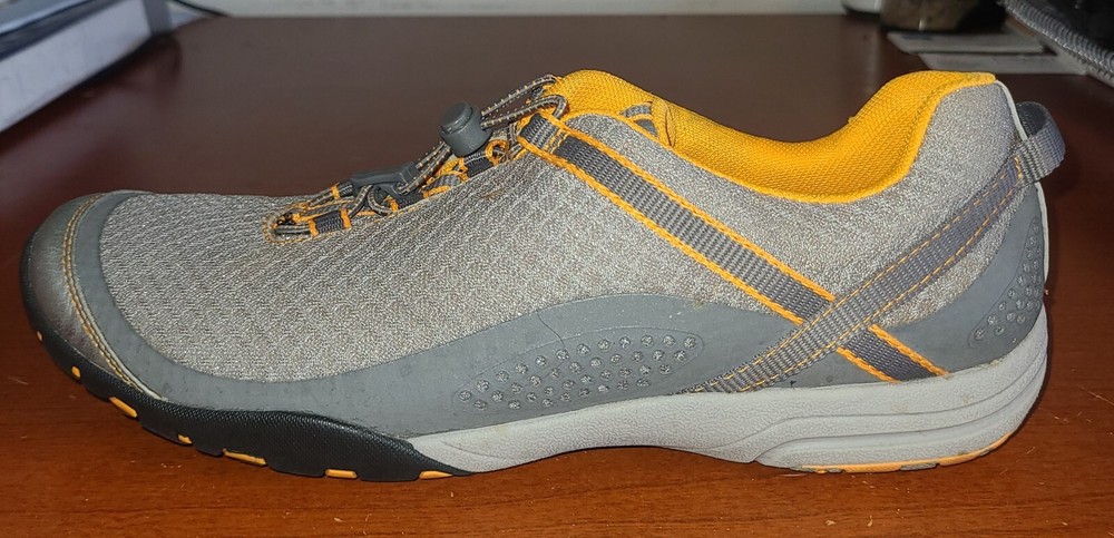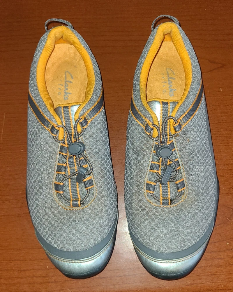 Elevate your activewear game with these Clarks Primo Women's 9M Shoes. These drawstring athletic sneakers come in a stylish gray and orange color combination and feature a low top shoe shaft style. The synthetic upper material is breathable and accented with the Clarks logo, while the fabric lining material ensures comfort. The shoes have a rubber outsole and cleat type, making them suitable for walking, cross-training, and running & jogging. They are perfect for any season - winter, summer, fall, and spring. These shoes are part of the Clarks product line and are customized to fit women's shoe size 9 (US) and 7 (UK), with an EU shoe size of 40. Get ready to hit the sports theme with these athletic shoes from Clarks.