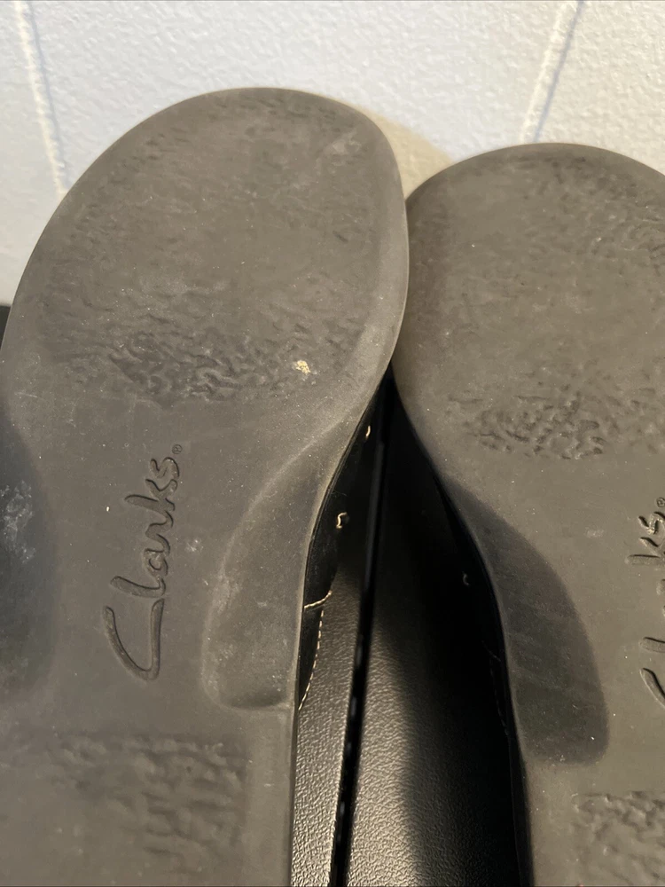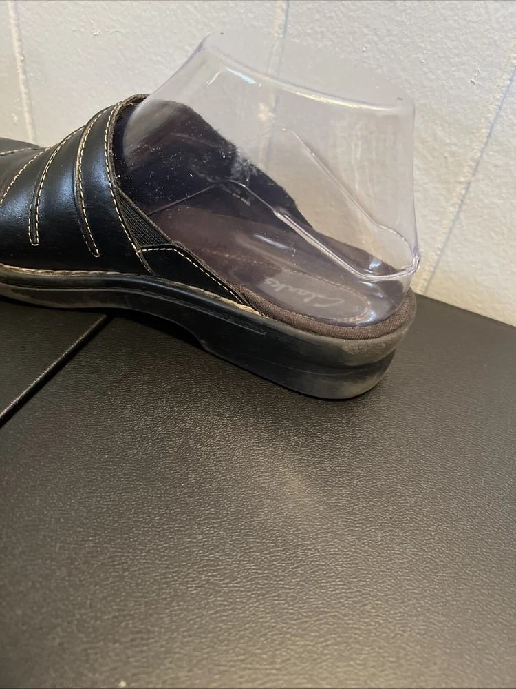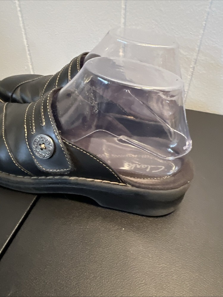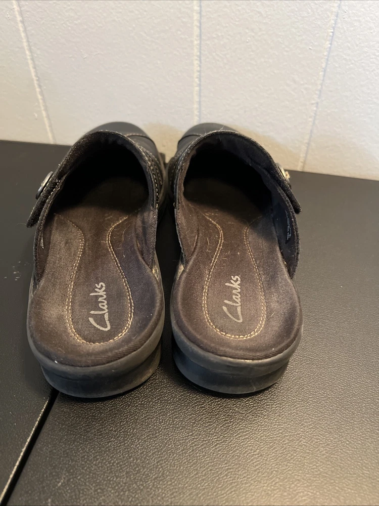 These are a pair of Clarks women's clog shoes in size 6M. They are black leather slip-on mules with a round toe and low block heel. The shoes are designed for comfort with a fabric lining and synthetic outsole. The style is classic and suitable for casual, workwear, and travel occasions. The model is Clarks 35039 from the Clarks Bendables product line, featuring a solid black color and a M width.