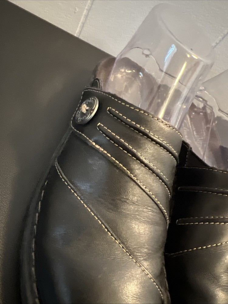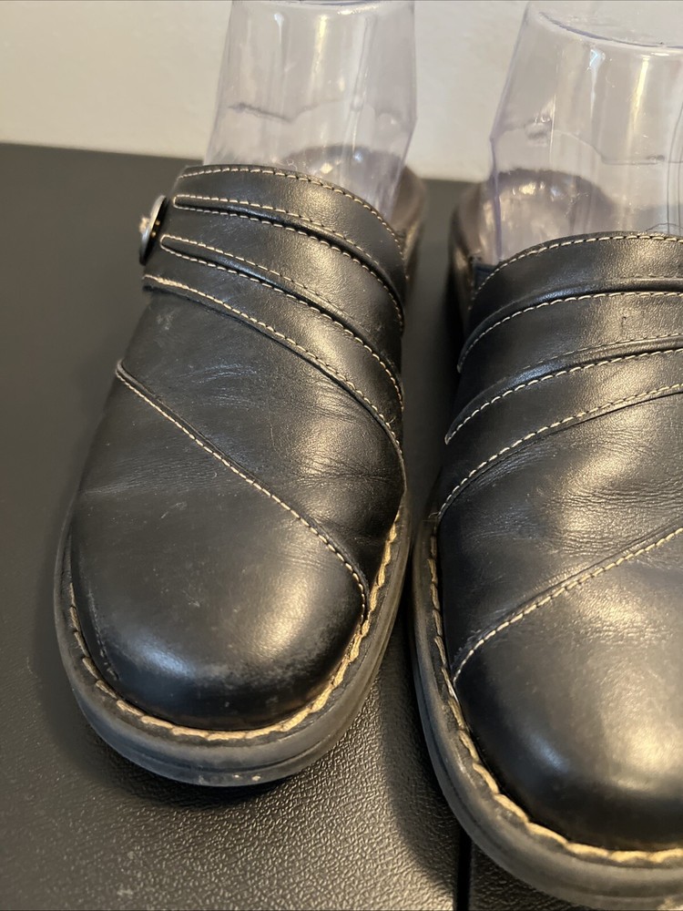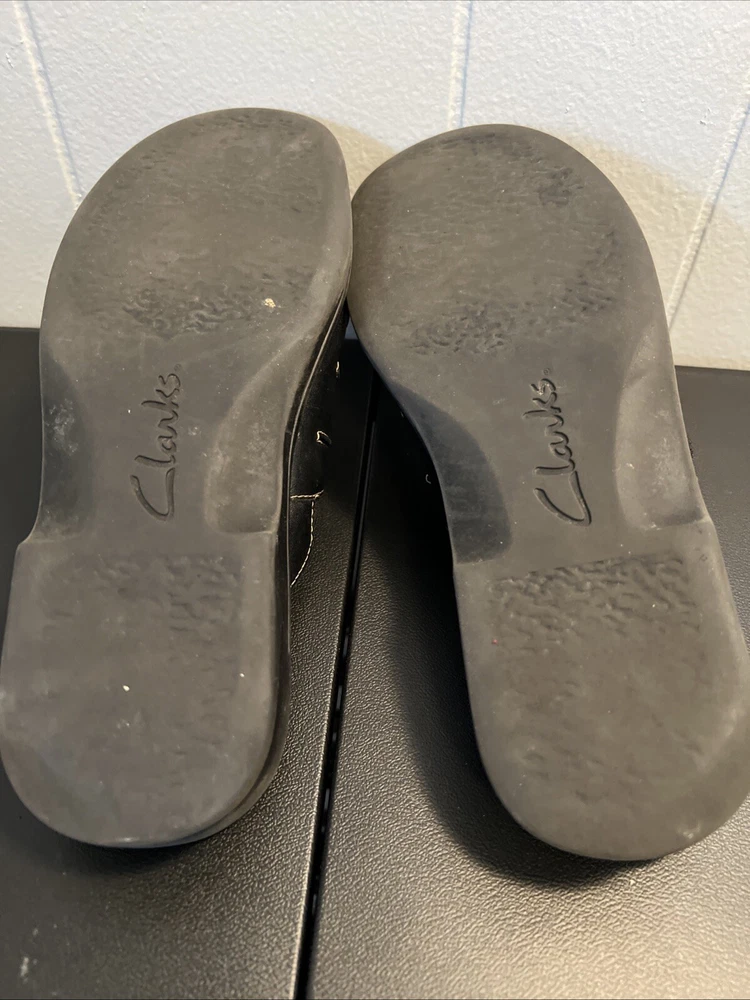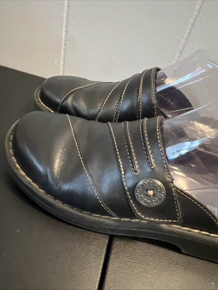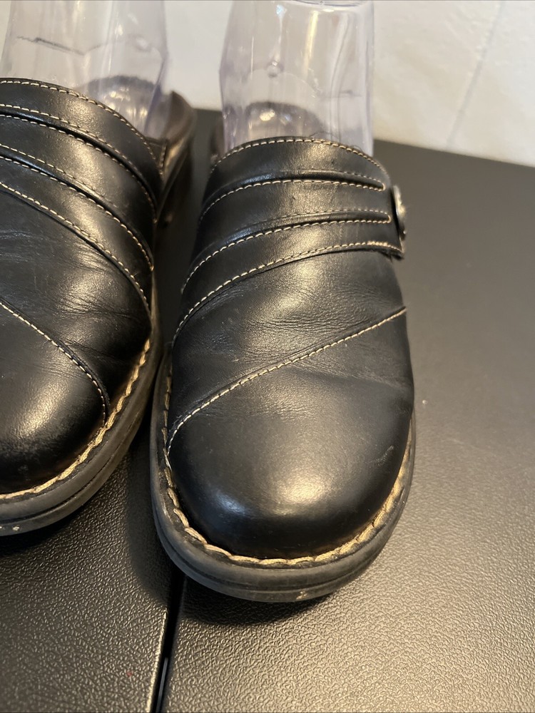 These are a pair of Clarks women's clog shoes in size 6M. They are black leather slip-on mules with a round toe and low block heel. The shoes are designed for comfort with a fabric lining and synthetic outsole. The style is classic and suitable for casual, workwear, and travel occasions. The model is Clarks 35039 from the Clarks Bendables product line, featuring a solid black color and a M width.