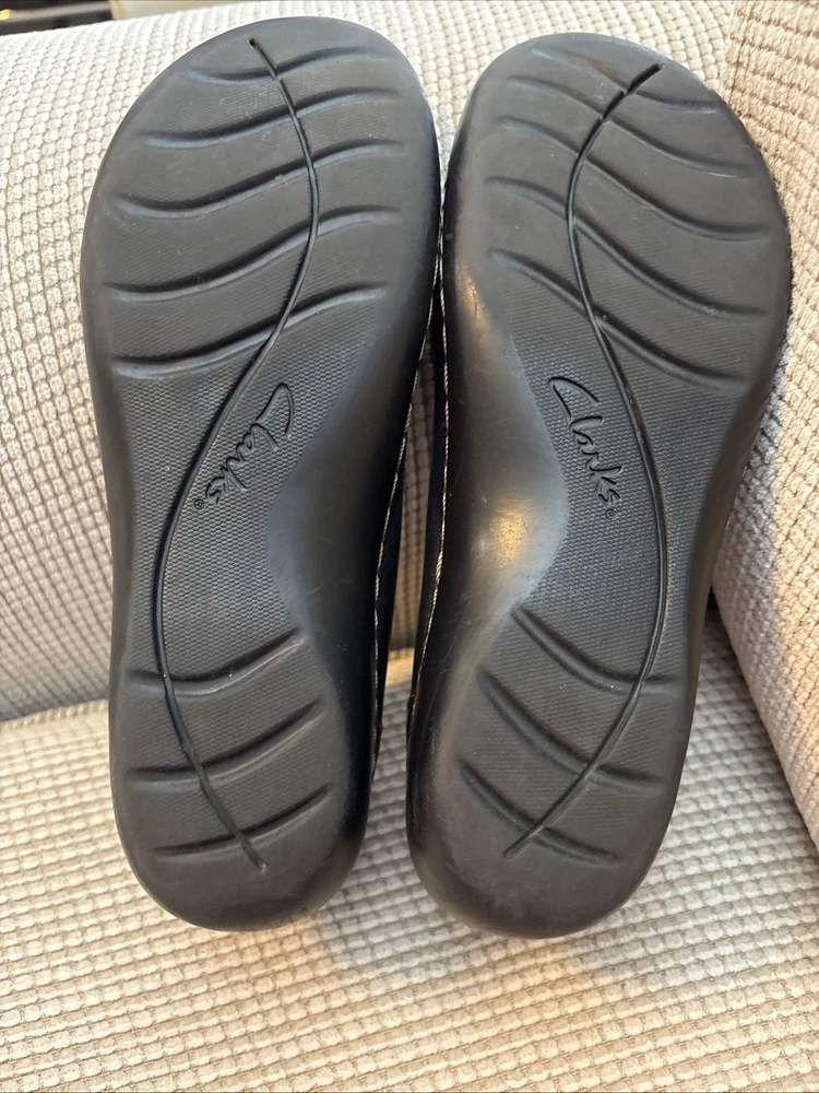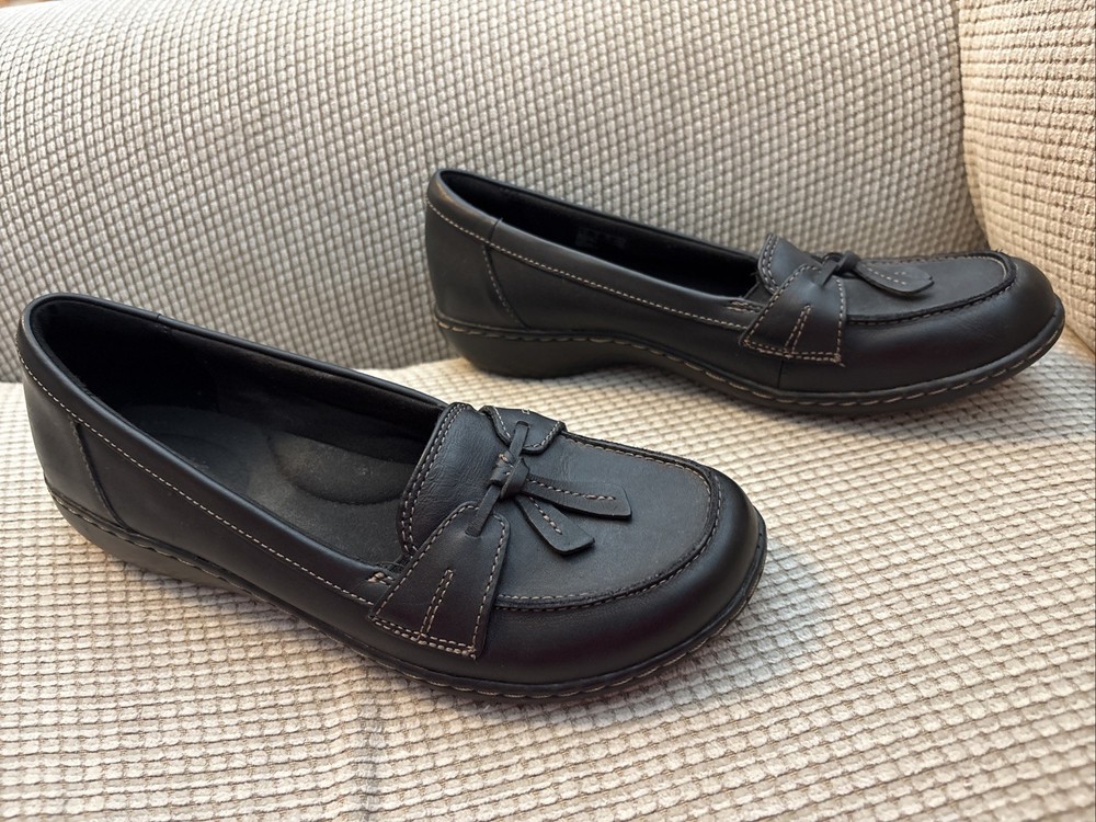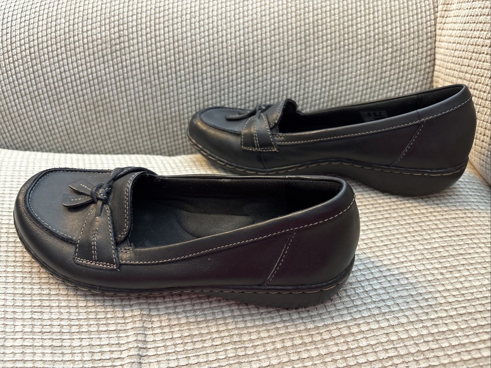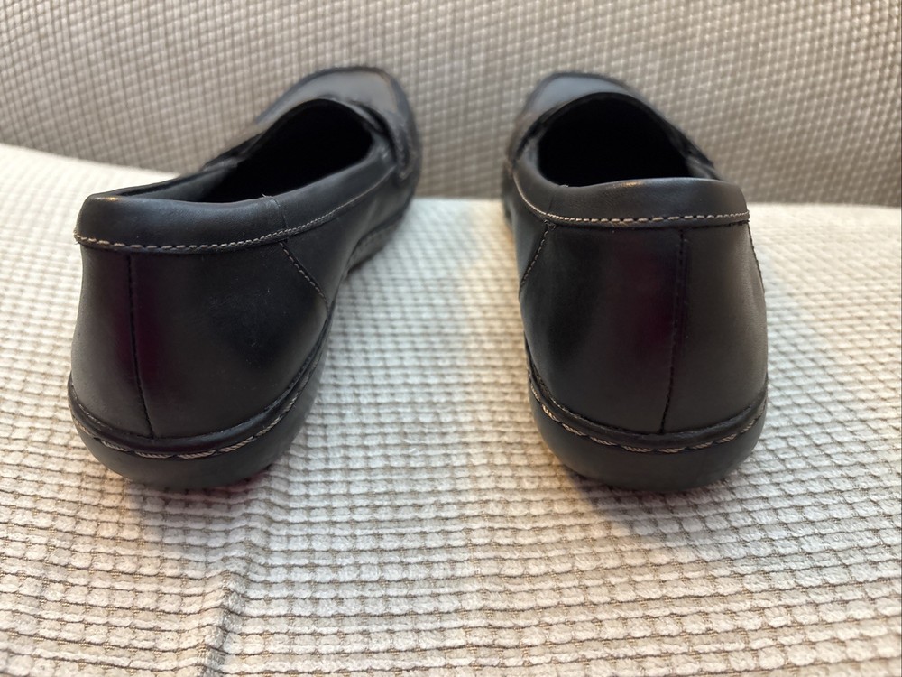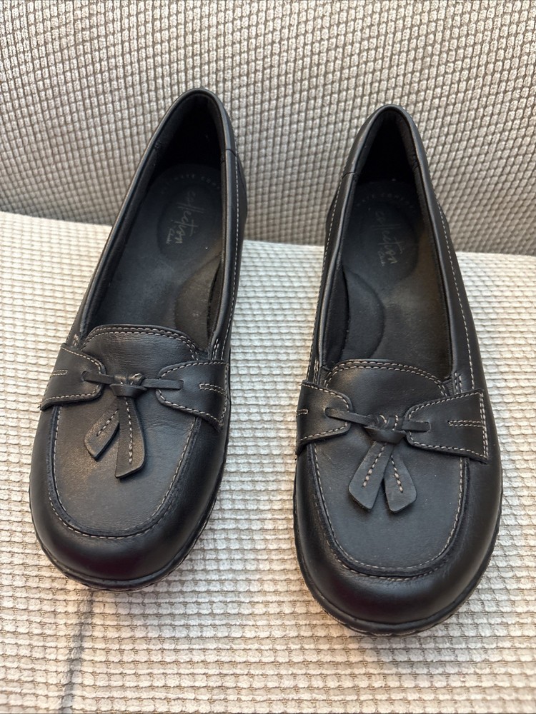 Elevate your shoe game with these classic Clarks Ashland Bubble loafers. Made with high-quality black leather, these slip-on flats feature a comfortable design that's perfect for any casual occasion. The shoes come in a size 8 and have a medium width, making them a great fit for most women. The loafers have a solid pattern with a subtle logo accent, giving them a timeless look that will complement any outfit. Whether you're dressing up for a day at the office or running errands around town, these Clarks Ashland Bubble loafers are a versatile addition to your shoe collection.