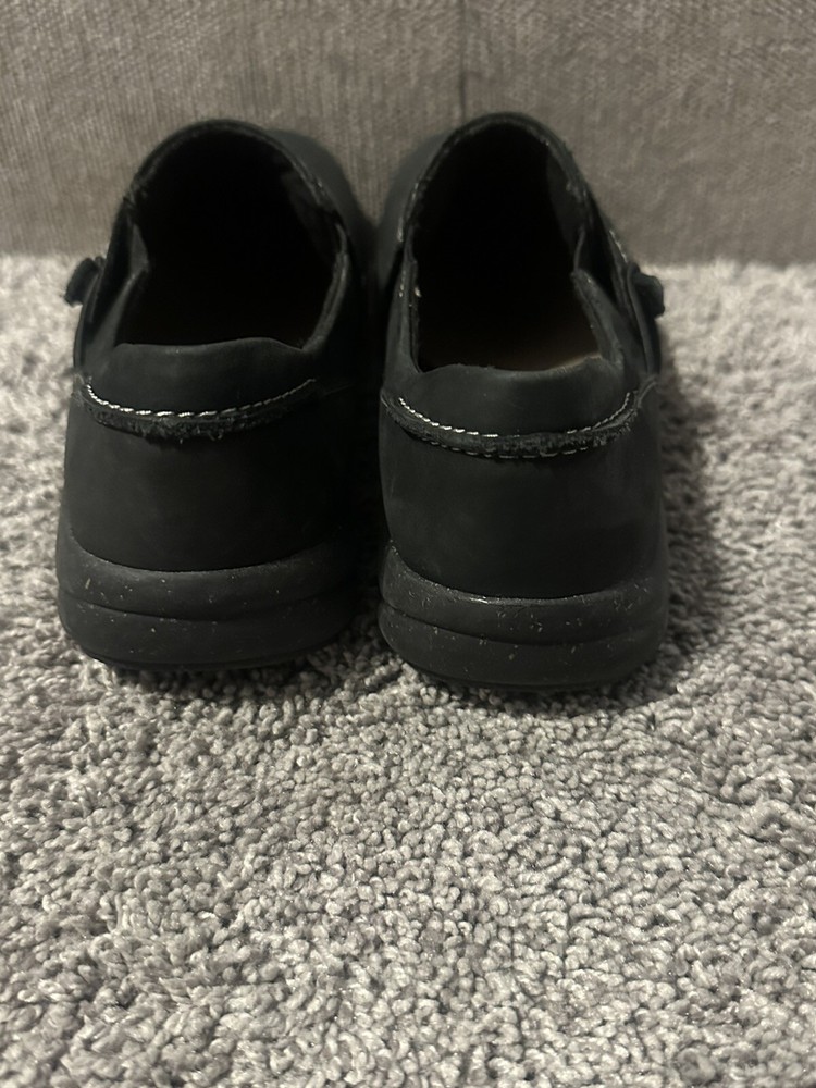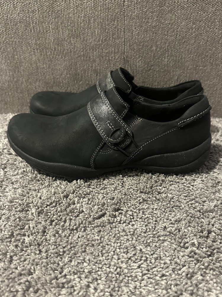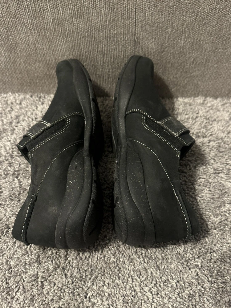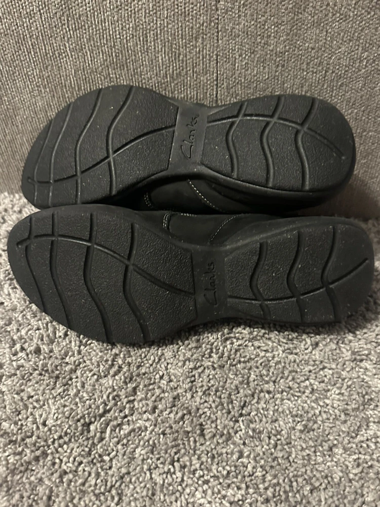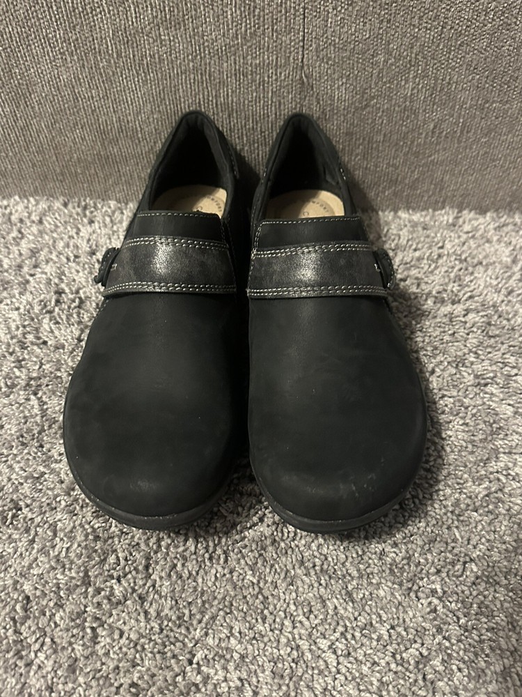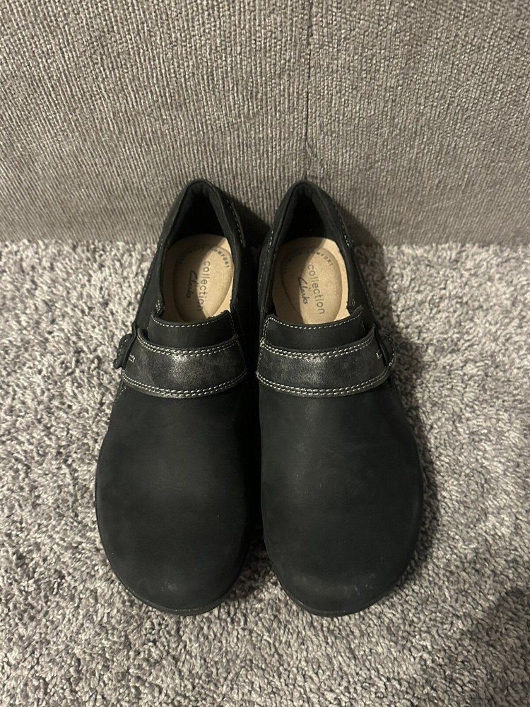 These are women's black leather loafers by Clarks in size 6. They feature a solid pattern, round toe shape, hook & loop closure, and a comfortable cushioned insole. The shoes are designed for casual or business occasions, with a rubber outsole for added durability. The upper material is leather, with a fabric lining and a medium shoe width. Perfect for going out in style and comfort. Preowned Good condition