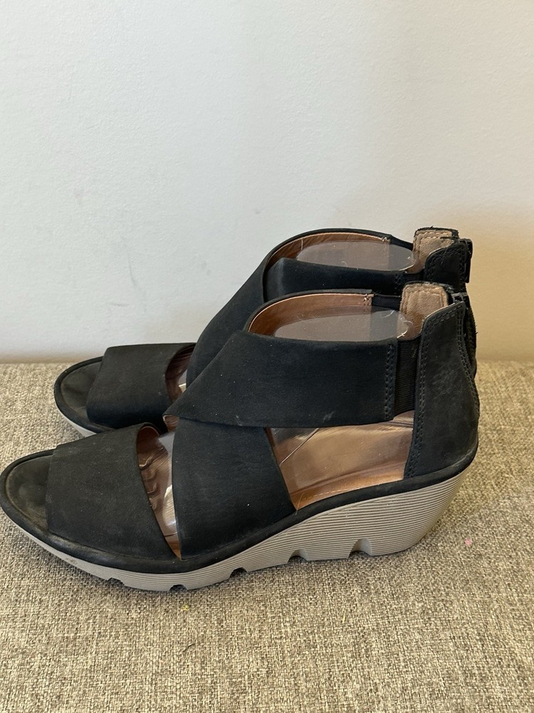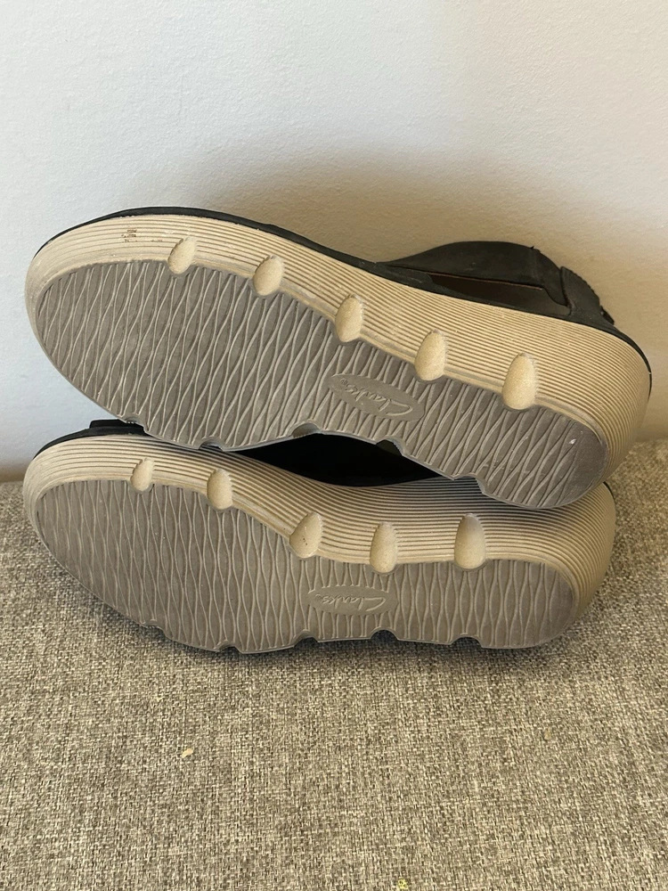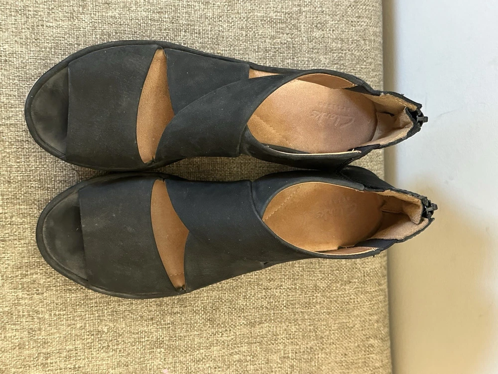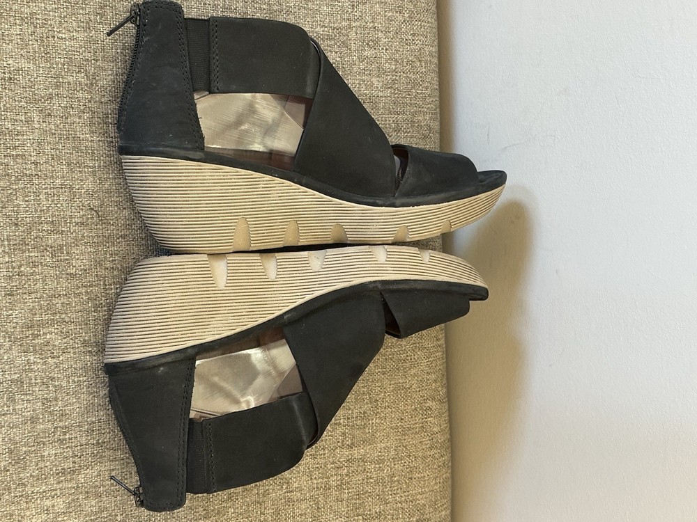 The product is a pair of Clark’s Women's Black Leather Wedge Zip Back Sandals in size 10. These stylish sandals feature a mid-height wedge heel, an open toe design, and a strappy style. Crafted from high-quality leather, they provide both comfort and cushioning for all-day wear. The zip closure makes them easy to take on and off, while the black color and solid pattern add a classic touch to any outfit. Perfect for a casual day out or a dressed-up occasion, these sandals are a versatile and timeless addition to any woman's footwear collection. Preowned Good Condition