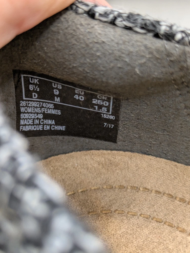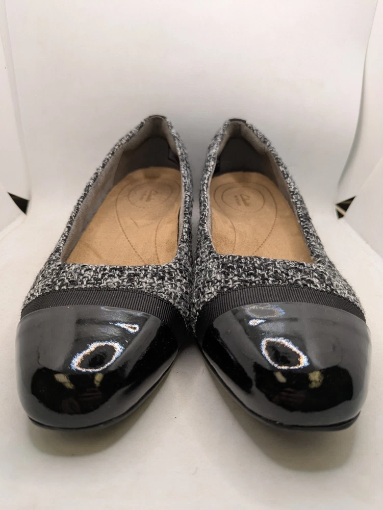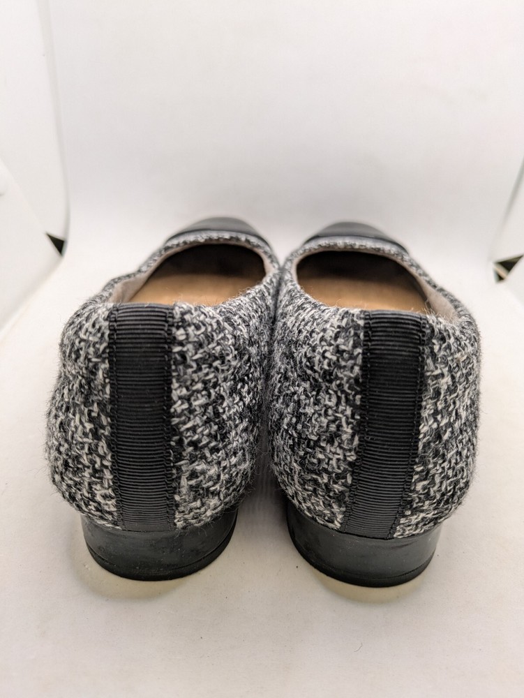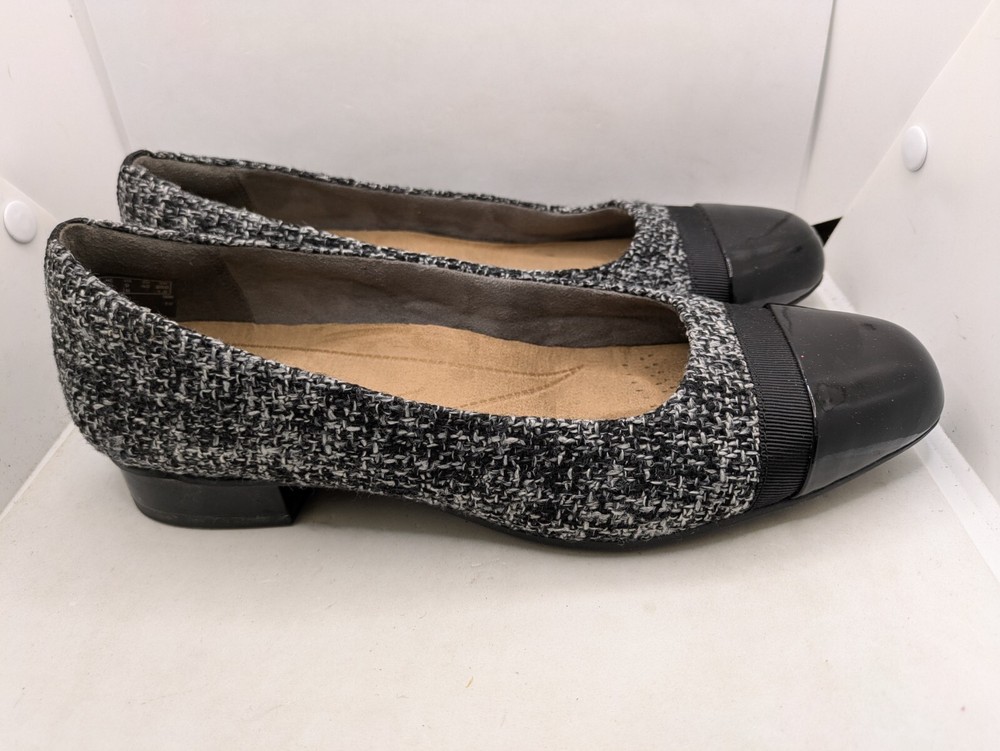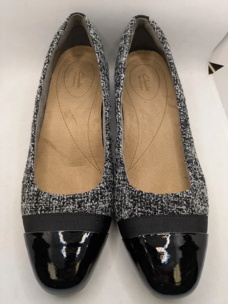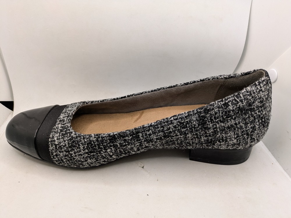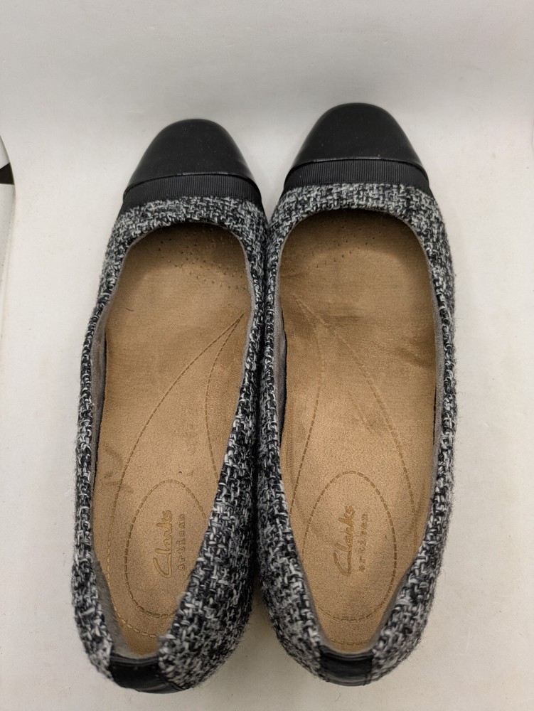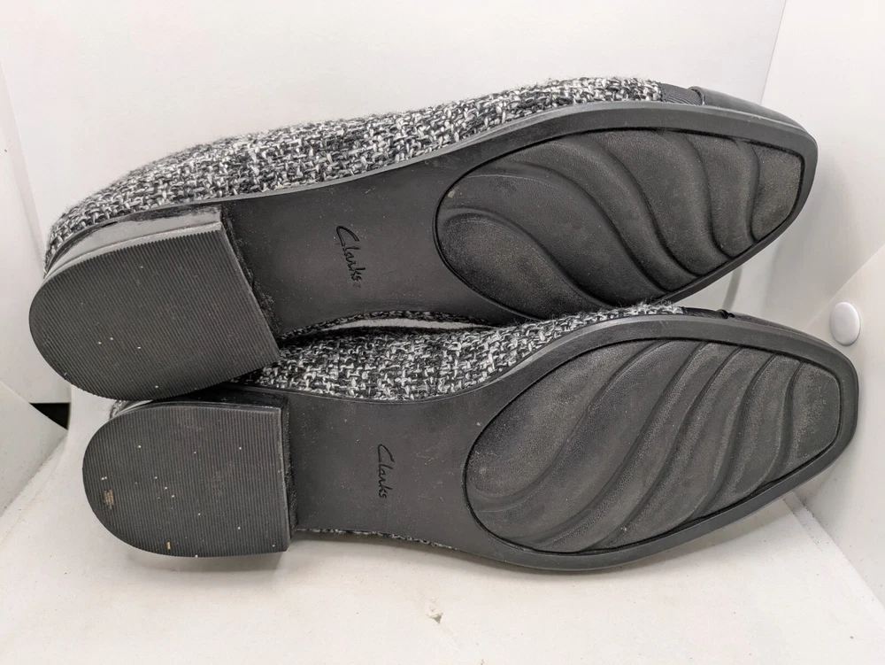 Dress up your feet in the sophisticated charm of Clarks Women's Juliet Monte Loafers. Woven in a timeless black gray tweed, these flats offer a versatile look that transitions effortlessly from office wear to casual outings. The fabric upper pairs with a supple leather lining and insole, ensuring comfort with every step. Designed with practicality in mind, the durable rubber outsole provides excellent traction, while the roomy 9.5US size accommodates a wider foot with its D width fitting. Whether you're dashing between meetings or enjoying a leisurely weekend, these Clarks loafers are a smart addition to your footwear collection.