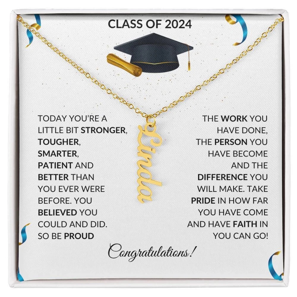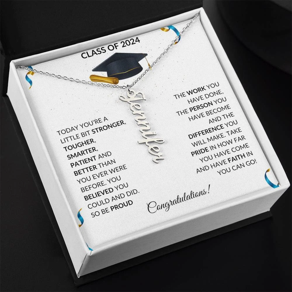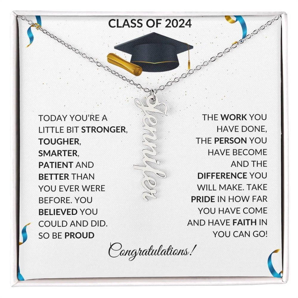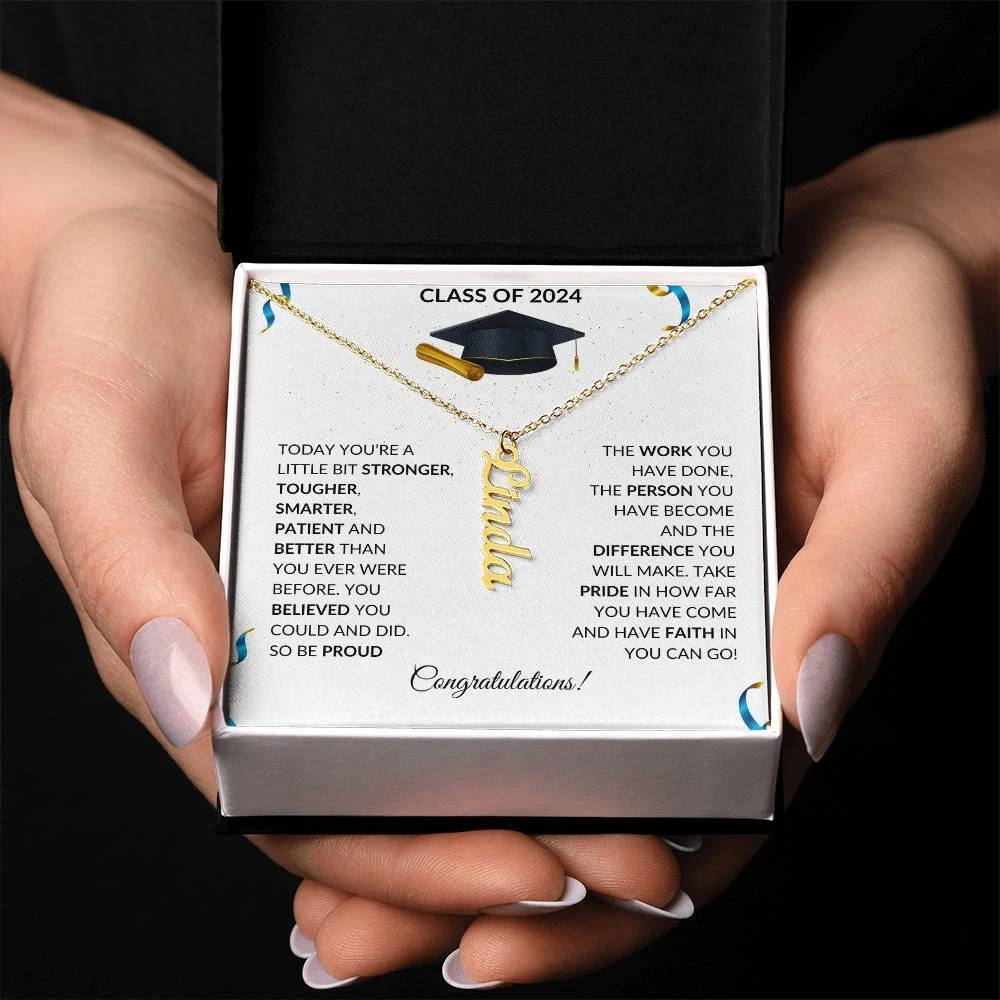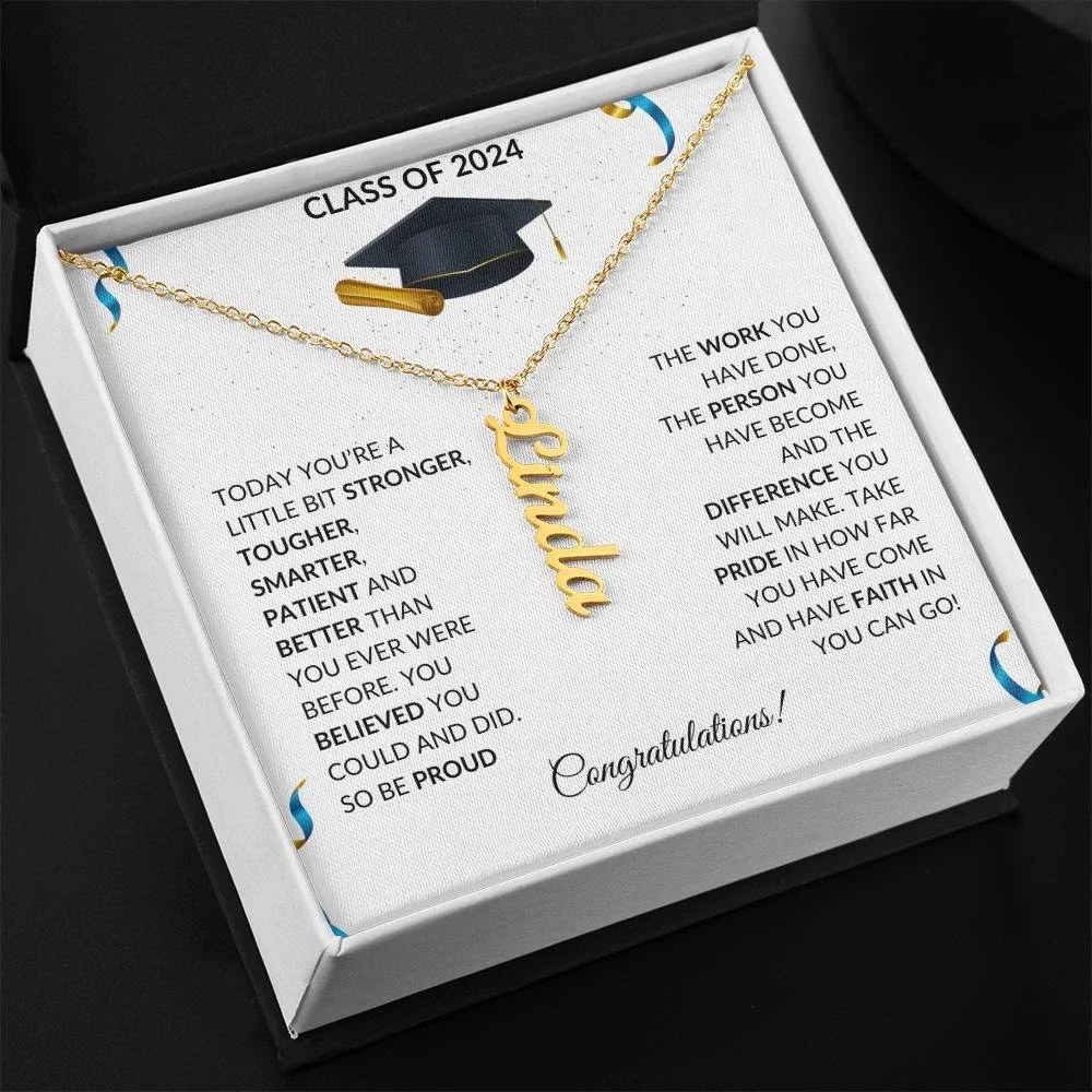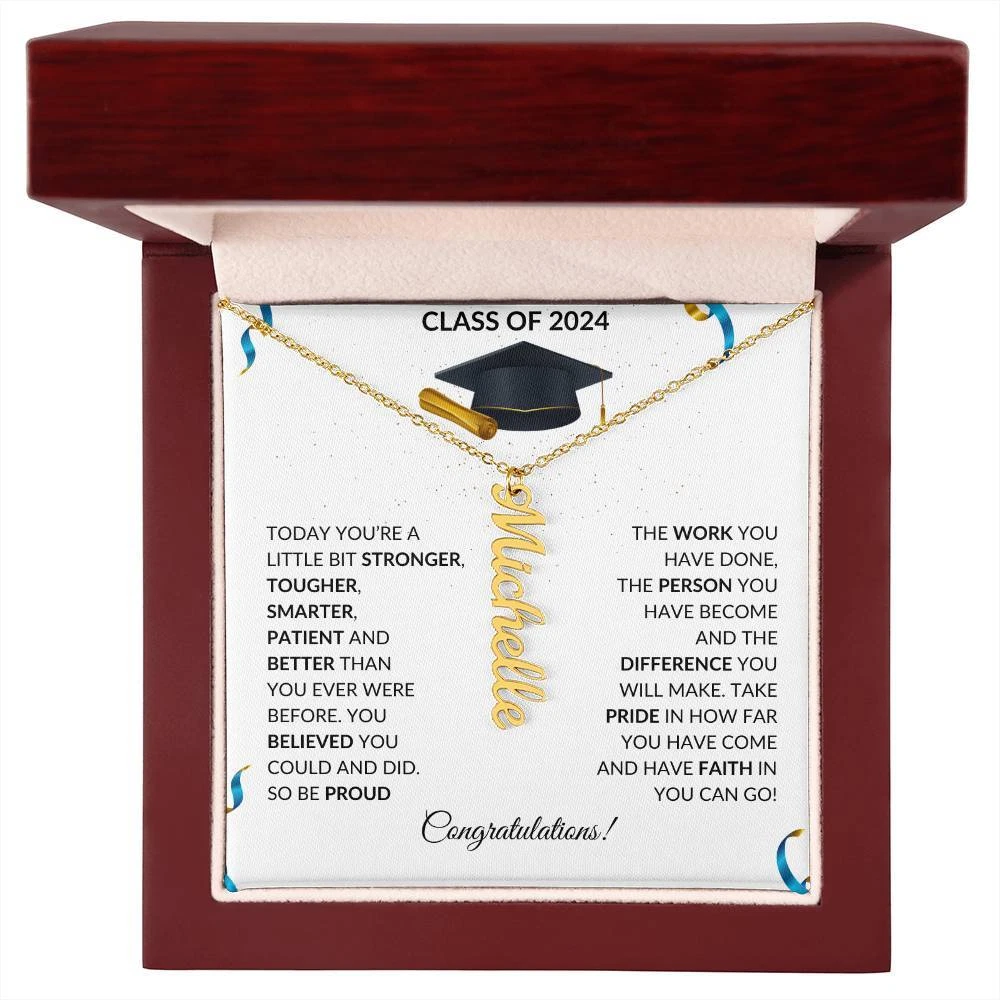 Class of 2024 graduation name necklace gift. Give your special someone a custom vertical necklace made just for them! Our Personalized Vertical Name Necklace is the perfect gift for your loved ones and will become a versatile accessory for any occasion. From a heart-warming holiday present, anniversary or birthday gift, or just because, this unique necklace adds a trendy touch to any outfit. MADE IN THE USA! This stylish necklace features a cursive name design suspended on an 16”-18” adjustable cable chain, making it both personal and beautiful! Your necklace will be custom made upon ordering in the name or word of your choice, with up to 10 characters. It's a gift that they will surely want to keep close to their heart forever! Product specifications: Customized with up to 10 characters Polished stainless steel or 18K yellow gold finish Adjustable cable chain (16”-18”) 9mm lobster clasp MADE IN THE USA! Your piece is lovingly packaged in a complimentary soft touch box for easy gifting. Elevate your presentation by upgrading to the mahogany style luxury box, which features a brilliant LED spotlight.