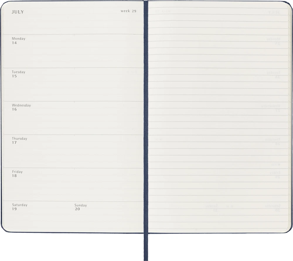 The 18-Month Weekly Notebook Diary/Planner runs from July to December. Formatted to show the week's appointments on the left and a ruled page for notes and ideas on the right, this popular planner style is perfect for students, teachers and professionals. - Dated from July 2024 to December 2025 - Sapphire Blue hard cover - Rounded corners, elastic closure and matching ribbon bookmark - Ivory-colored, 70 g/m², acid-free paper - Useful tools: calendar, travel planning, ideas and goals, ruled pages for notes - Stickers to customize your plans and year stickers for the spine - Color-coordinated expandable inner pocket - 'In case of loss' notice printed on the flyleaf - Lies flat, opens at 180° - Dimensions, 5" x 8.25" - The paper of this object is made of material from well-managed, FSC®-certified forests and other controlled sources. dated from July 2024 to December 2025 hard and soft cover available in a variety of colors; ivory-colored, 70 g/m², acid-free paper rounded corners, elastic closure and matching ribbon bookmark; color-coordinated expandable inner pocket useful tools: calendar, travel planning, ideas and goals, ruled pages for notes. Stickers to customize your plans and year stickers for the spine the paper of this object is made of material from well-managed, FSC -certified forests and other controlled sources.