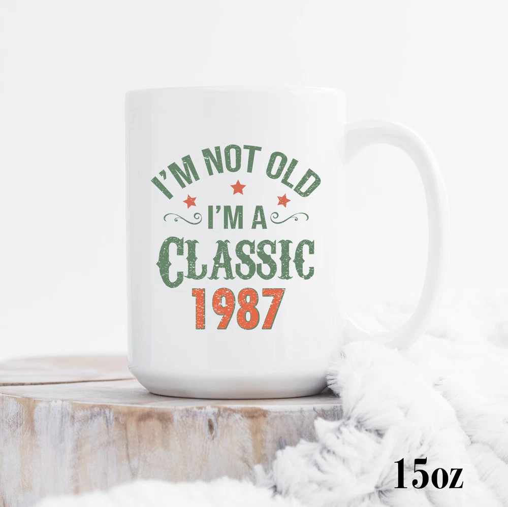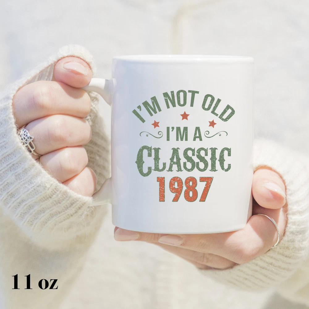Classic 1987 Personalized Birthday Mug Birthday Mug Birthday Gift Vintage Mug Product Details.. This high quality 11oz. ceramic white mug has a premium hard coat that provides crisp and vibrant color reproduction sure to last for years. Perfect for all hot & cold beverages. The highest quality printing possible is used. It will never fade no matter how many times you wash it. Material: 100% Ceramic. Print both sides. Dishwasher and Microwave Safe. High Gloss + Premium White Finish. Printed in the U.S.A. Personalized & Custom. We support personalized and custom mug to add custom, when placing an order, you can add notes to the "order note" in shipping address section. Also you can contact us directly via message. Shipping Info. Ready to ship in 1 to 2 business days, All products are made-to-order and proudly printed in the United States. Shipped by USPS and DHL, You will receive your order in 5-7 days. Replace & Refund. All products are defective during shipping broken, chipped will be replaced free of charge. You are not satisfied with the product, we will refund 100% money to you. If any other issues arise, please do not hesitate to message, we would be more than happy to assist you.