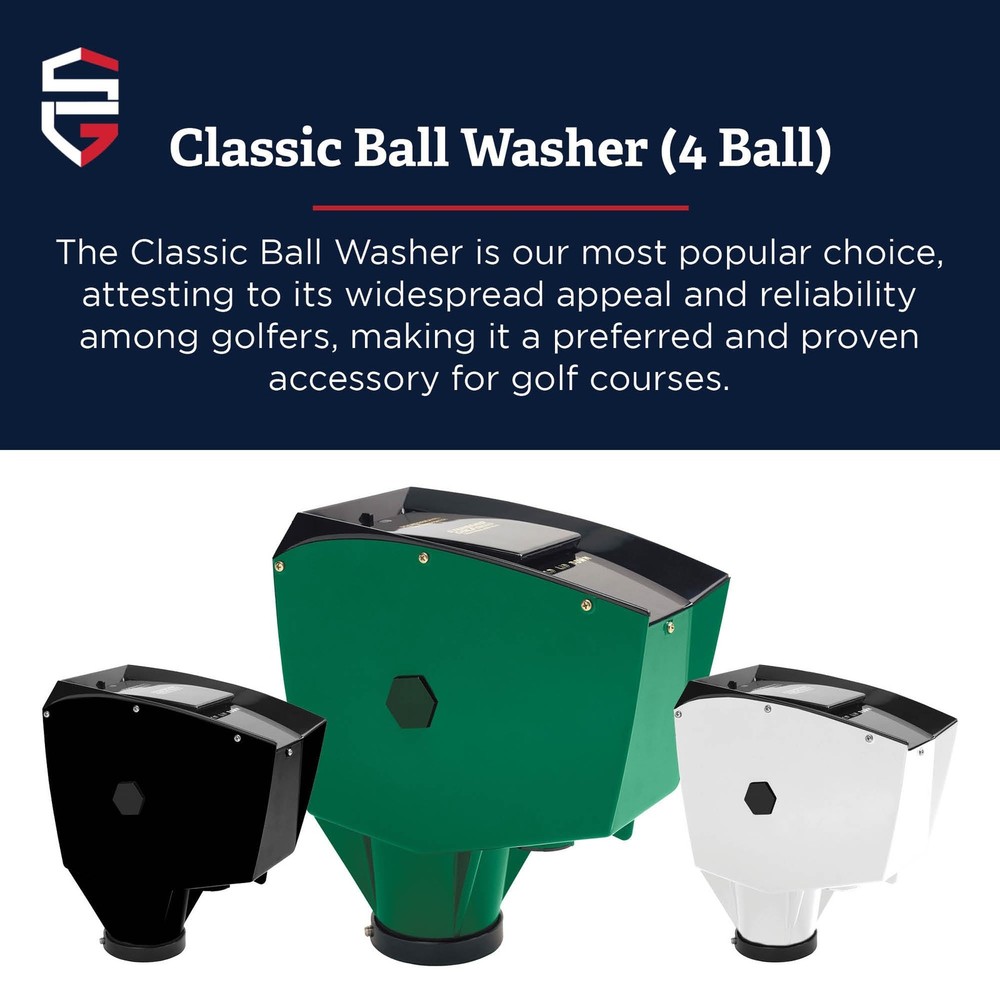 Our most popular washer. Rugged. Affordable. Available in seven different colors. Crank-style washer with four ball capacity. Built-in overflow tubes prevent leaks and soap buildup. New and improved brush design. CRANK STYLE DESIGN - This classic design ensures efficient and hassle-free ball washing. The crank style operation delivers a smooth and effective cleaning process, allowing users to effortlessly maintain the pristine condition of their golf balls. Whether you're a dedicated golfer or a golf course professional prioritizing efficiency, this ball washer stands out as a reliable and user-centric solution for keeping your golf balls in top-notch condition. INNOVATIVE OVERFLOW PROTECTION - The Classic Ball Washer is thoughtfully designed with built-in overflow tubes, a feature that goes beyond cleaning to ensure a mess-free experience. These tubes effectively prevent spillage, making it the epitome of a clean and efficient golf ball washer. The overflow prevention not only maintains cleanliness but also enhances the overall usability of this portable golf ball cleaner. ENHANCED CLEANING PRECISION - Elevate your golf ball cleaning experience with our Classic Ball Washer's improved brush design. This innovation ensures a meticulous and thorough clean for your golf balls. The specially designed bristles delve deep into the grooves of the ball, providing an effective and reliable cleaning solution. This attention to detail makes it an indispensable portable golf ball cleaner, catering to the needs of both avid golf enthusiasts and professional golf courses alike. FOUR BALL CLEANING - Boasting a substantial 4-ball capacity, this innovative design allows simultaneous cleaning of multiple balls, making it a time-saving essential for bustling golf courses or club professionals managing high-volume play. Whether you're aiming for continuous play on the course or maintaining optimal performance as a club pro, this ball washer stands out as a reliable and time-efficient solution, accommodating the demands of busy golfing environments with ease. AMERICAN-MADE SETS THE STANDARD - Founded in 1910, is an American-made, employee-owned company that supplies professional-grade golf course supplies and accessories to clubs and golf courses worldwide. With our top-notch equipment, now you can re-create an authentic golfing experience at home, bringing the prestige of a course to your doorstep. BREAKING IN - Out of the box, the crank on the ball washer will be a bit hard to turn, as it is not fully broken in. Over time, as the ball washer is used, the crank will become easier to turn. We recommend a drop of liquid soap & 6-8 ounces of water for cleaning. Our Ball washer fits on a post of 2 and 3/8" outside diameter and it comes with a set screw.