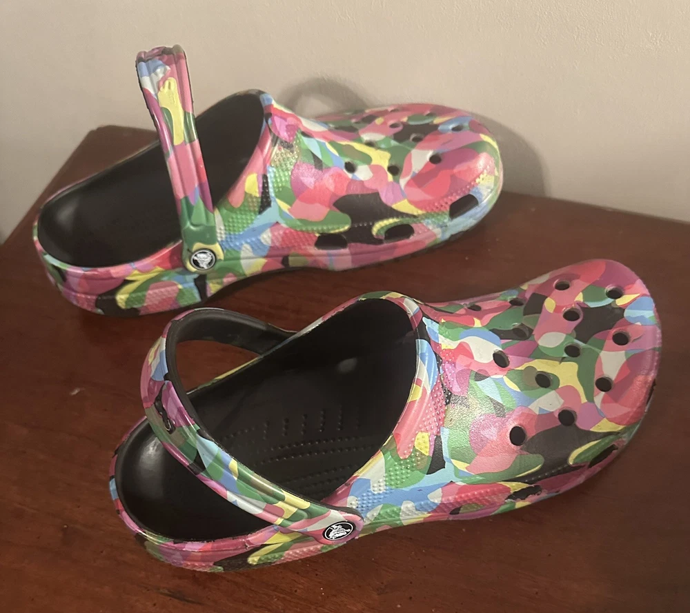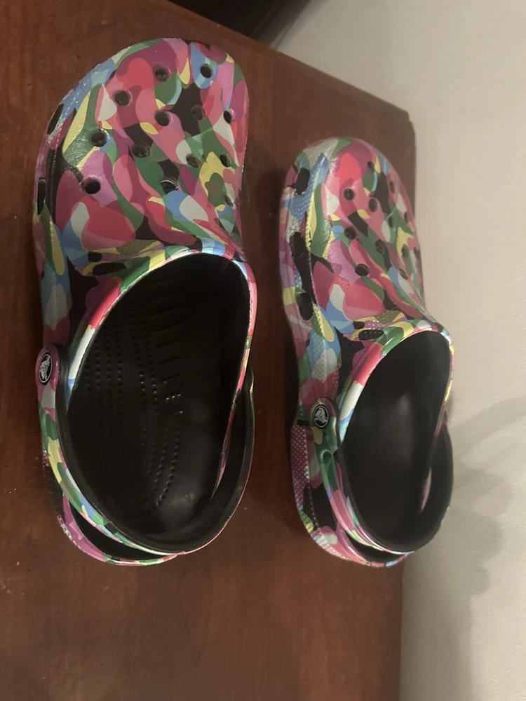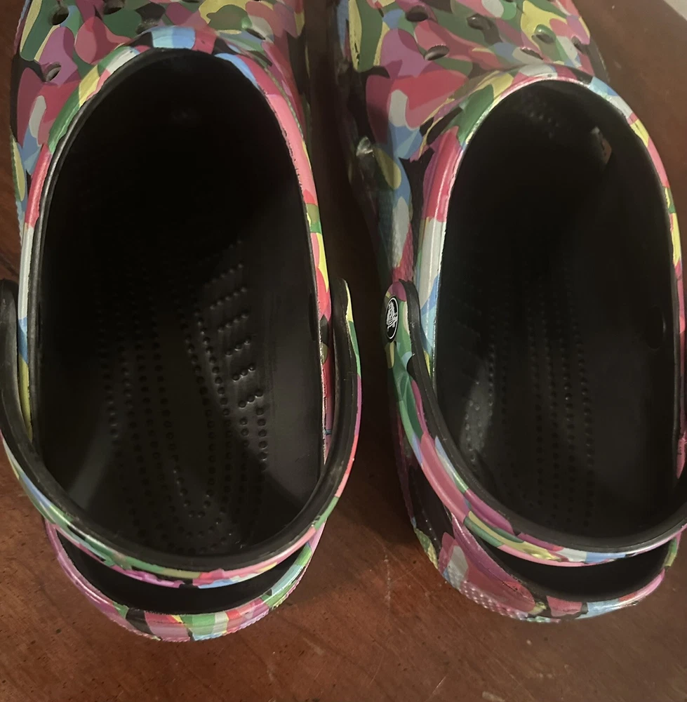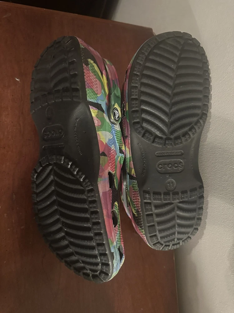 They’re in great condition only used for indoor shoes. The Classic black block Crocs with Bubble Block design in size 11 feature a unique bubble block pattern on a multicolor design. These unisex casual clogs from the Crocs brand are made of Croslight Foam material, providing arch support, waterproofing, and lightweight comfort.