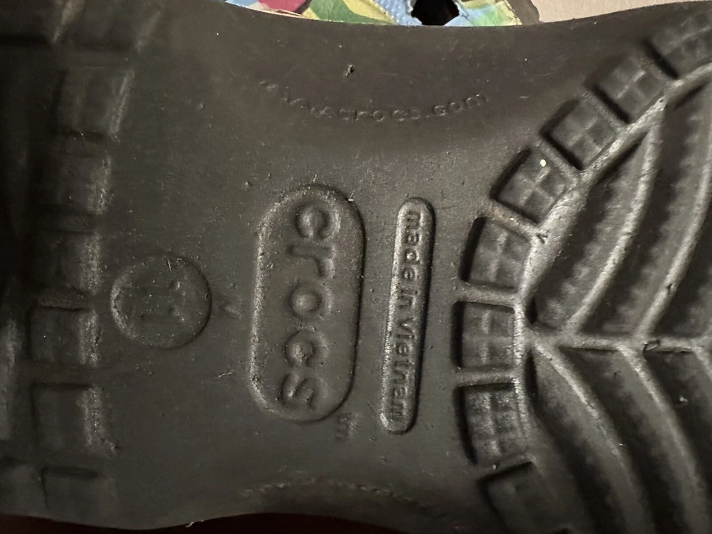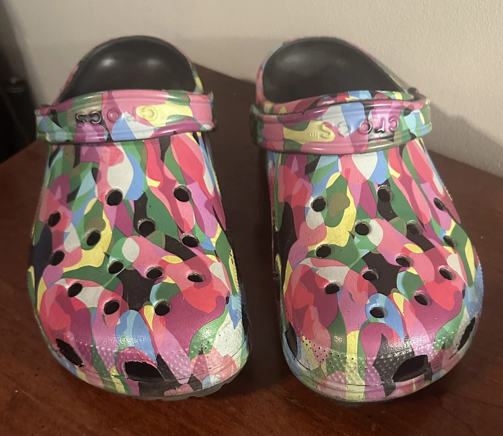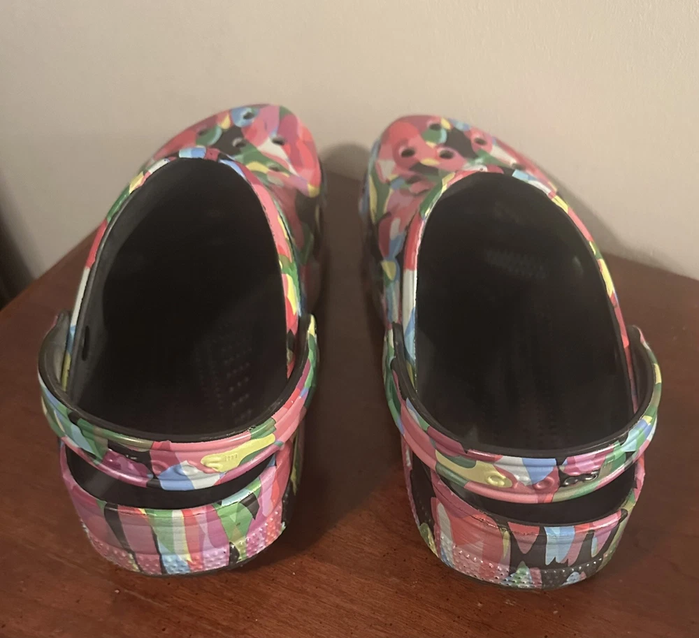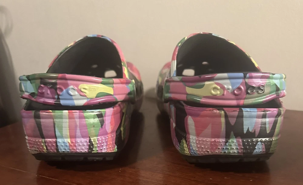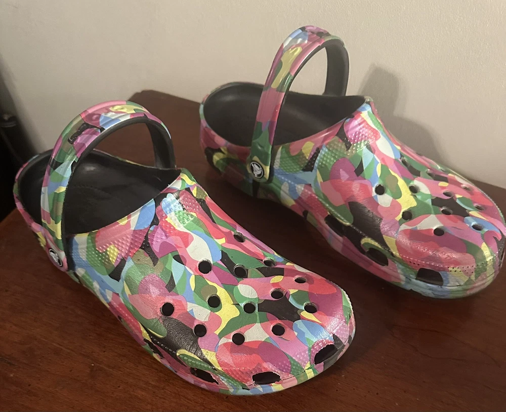 They’re in great condition only used for indoor shoes. The Classic black block Crocs with Bubble Block design in size 11 feature a unique bubble block pattern on a multicolor design. These unisex casual clogs from the Crocs brand are made of Croslight Foam material, providing arch support, waterproofing, and lightweight comfort.