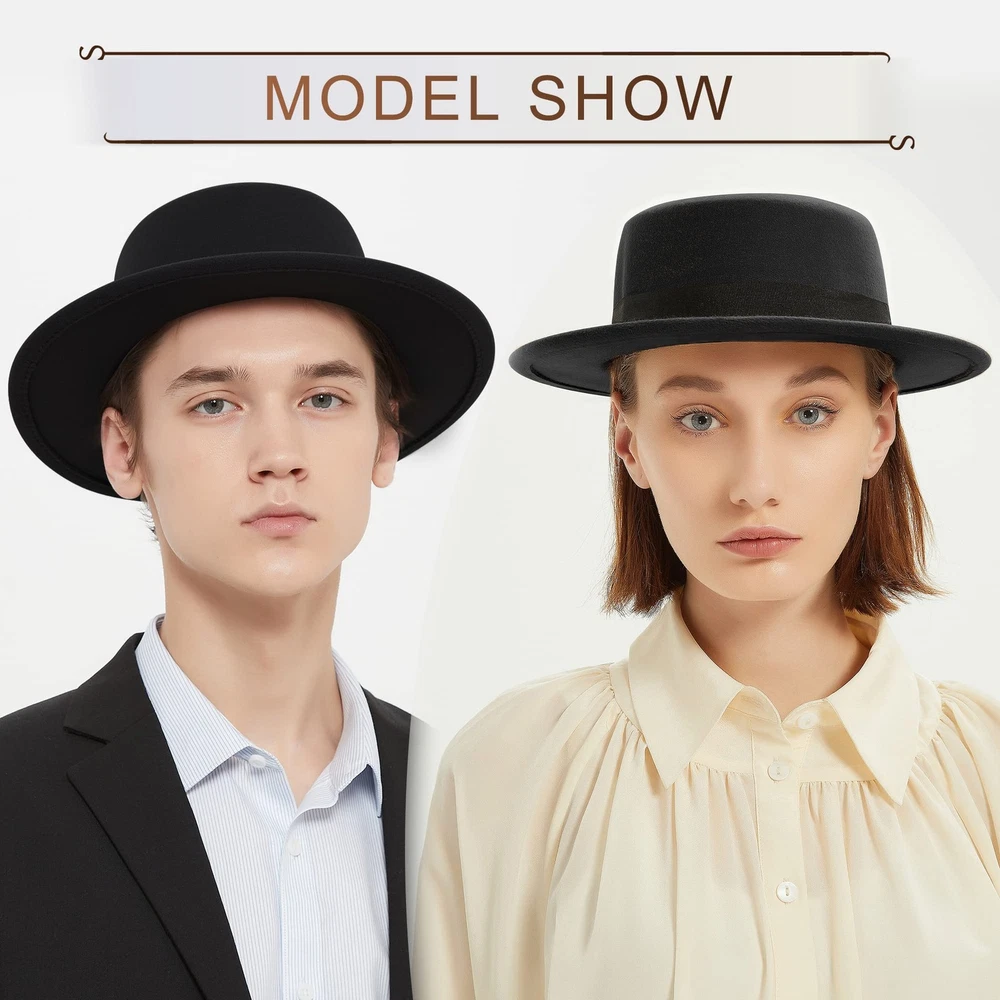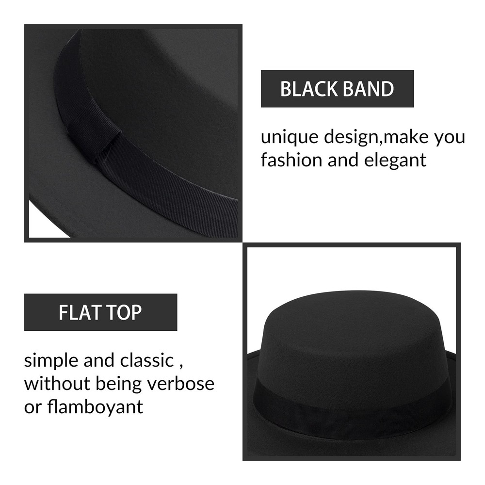 Classic Fedora Hat Flat Top Felt Pork Pie Wide Brim Medium, Black Product Details ▶Material:The fedora hat is made of polyester and cotton material,comfortable and breathable,soft textured feel that is perfect for spring,autumn and winter. ▶Size:Hat circumference:57-58cm/22.5"-22.8",brim width:M:5.5cm/2.17",Height:8.5cm/3.4",suitable for most women and men.and with adjustable strap Inside,you can adjust the fedora hat to fit well. ▶Design:This flat top fedora is a combination of classic and stylish,classic design with band will make you fashion and elegant,without being verbose or flamboyant. ▶Packaging:We will pack each hat with a hat support and ensure it doesn't bent and out of shape in transit.You'll receive a perfectly shaped hat that you can wear immediately. ▶Occasion:The fedora is a nice accessory for your outfits,suitable for wedding party,birthday,club,vacation,travel,photography,tea parties,indoor and any outdoor activities.and it is a perfect gift for family and friends.