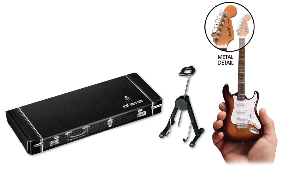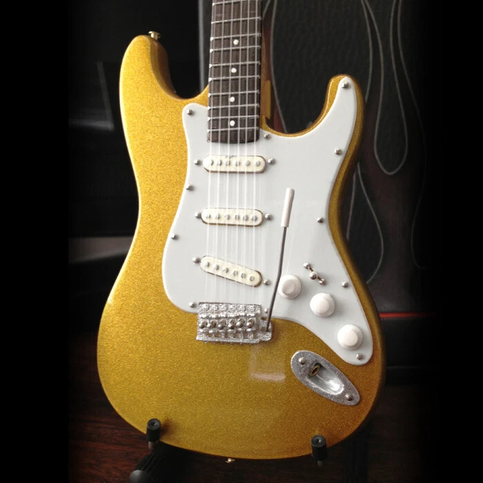 Gold Fender™ Strat™ Miniature Guitar Replica - Officially Licensed Each guitar model is approximately 10" in length and comes complete with a high-quality miniature adjustable A-frame stand and AXE HEAVEN® guitar case gift box. Famously played upside down by Pete Townshend of The Who and Eric Clapton of Cream AXE HEAVEN® has created officially licensed by Fender™ one-of-a-kind miniature replica models to commemorate the iconic Fender™ instruments, such as the Telecaster™, Stratocaster™, Precision Bass™ and Jazz Bass™ guitars. Miniature Replica Guitars Make Great Gifts! Each miniature replica guitar is 1:4 scale and is individually handcrafted, with metal tuning keys. Each guitar model is approximately 10” in length and comes complete with a high-quality miniature adjustable A-frame stand and a guitar case gift box. Our Miniature Replicas Look Great But Are Not Playable
