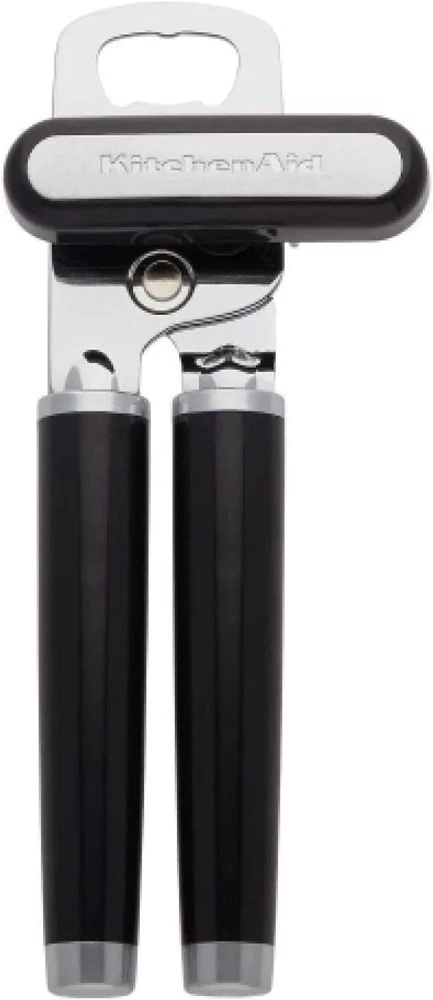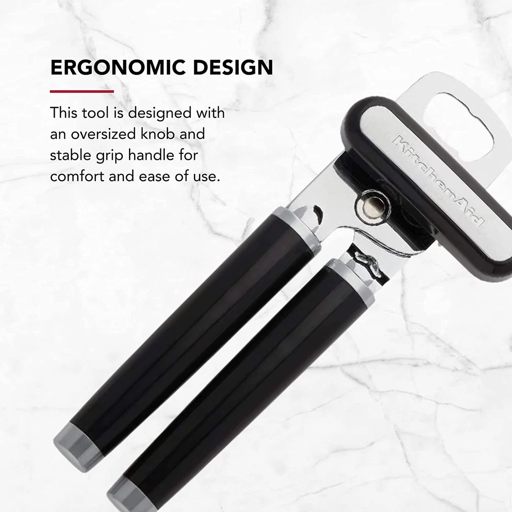 EASY OPENING: the durable, razor-sharp stainless steel cutting wheel easily pierces and smoothly slices through cans SIMPLE OPERATION: the large, easy-to-turn knob provides a secure grip for effortless turning OVERSIZED & ERGONOMIC HANDLES: provide maximum comfort and control for simple, safe use 2-IN-1 TOOL: features an integrated bottle opener to remove caps with ease VERSATILE: for use with any sized can or bottle Open any sized can or bottle with the KitchenAid Classic Can Opener. The durable, razor-sharp stainless steel cutting wheel easily pierces and smoothly slices through cans, while the large knob provides a secure grip for effortless turning. The oversized, ergonomic handles provide maximum comfort and control for simple, safe use. This 2-in-1 tool features an integrated bottle opener to remove caps with ease. Hand wash with warm water and a mild detergent; rinse and dry immediately. One year hassle-free replacement and lifetime limited warranty.