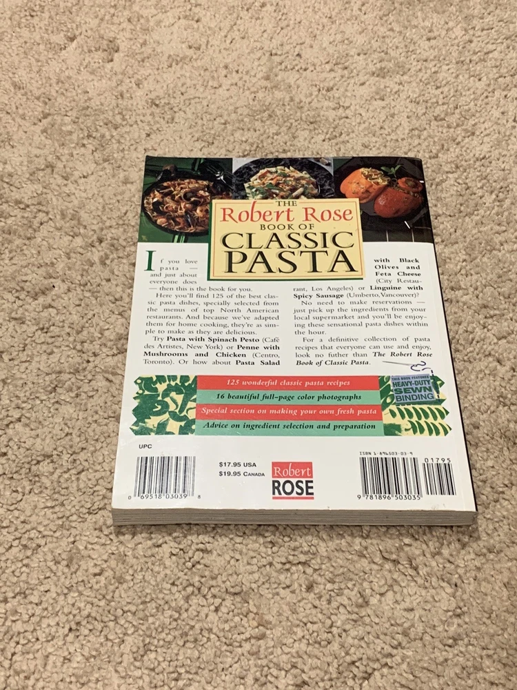 ISBN-13:9781896503035TitleLeading:TheSynopsis:The ultimate book for pasta lovers. The Robert Rose Book of Classic Pasta brings you over 100 exquisite pasta recipes, specially selected from the menus of top North American restaurants. Adapted for home cooking, they're as simple to make as they are delicious -- all ingredients are readily available and quick to prepare. This book will be a classic in your kitchen., The Robert Rose Book of Classic Pasta, brings you over 100 exquisite pasta recipes, specially selected from the menus of top North American restaurantPublisher:Rose Incorporated, RobertIntended Audience:Tradegtin13:9781896503035Item Height:0.6 inItem Width:7 inItem Weight:15.9 OzNumber of Pages:192 PagesIllustrator:YesISBN-10:1896503039Author:Robert Rose Incorporated StaffGenre:CookingLanguage:EnglishPublication Year:1997Topic:Specific Ingredients / PastaBook Title:Robert Rose Book of Classic PastaItem Length:10 inFormat:Trade Paperbackbrand:Rose Incorporated, Robert