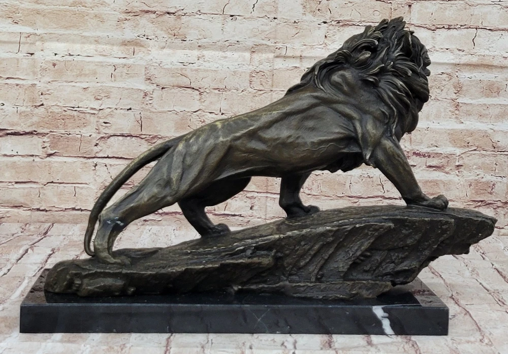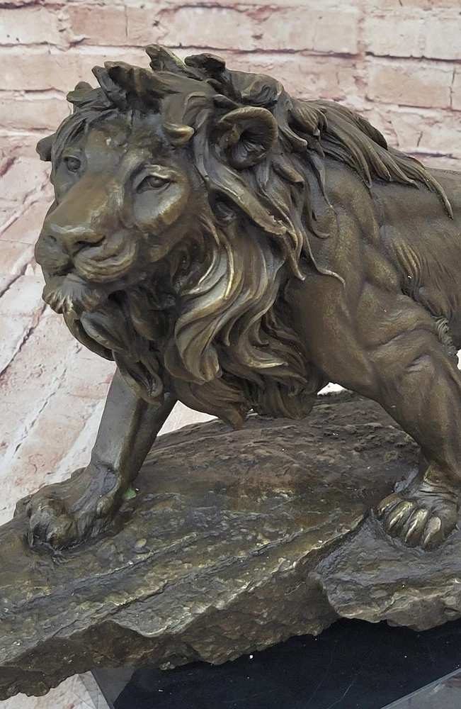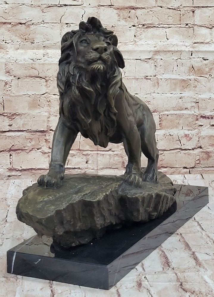 Classic Pure Bronze Copper Africa Lion Statue Evil Foo Dog Lion Sculpture Gift Classic Pure Bronze Copper Africa Lion Statue Evil Foo Dog Lion Sculpture Gift Condition : This sculpture is in perfect condition. Bronze Dimensions with Marble Base: Height 14" X Width 22" Marble Dimensions:18" X 6" Height without base:13" Weight:35 LBS Inventory:27YRD67814572 Behold the majestic presence of the regal lion in all its splendor, immortalized in this breathtaking bronze sculpture. As the golden sun dips below the horizon, casting its ethereal glow, the lion ascends a cliff with an air of undeniable authority. Its magnificent mane ripples in the plains winds, a testament to its untamed strength and dominance. With a commanding gaze, the lion surveys its kingdom, a realm teeming with life and vitality. This sculpture captures not only the lion's physical prowess but also its symbolic significance—a representation of courage, power, dignity, and the unwavering spirit of royalty. Crafted with meticulous attention to detail, this handmade bronze sculpture is a true testament to the artistry of the lost-wax casting method. The intricate textures of the lion's fur, the intensity of its expression, and the sense of motion as it climbs the cliff are all masterfully rendered. A rich brown patina finish both protects and enhances the sculpture's timeless beauty, ensuring its endurance for generations to come. Resting upon a dignified black marble base, this artwork bears the signature of the esteemed artist Barye, a mark of quality and exceptional craftsmanship. Invite the regal essence of the lion into your space with this remarkable bronze sculpture. Whether displayed in a home, office, or gallery, it serves as a profound reminder of the lion's enduring symbolism and its role as a guardian of power and wisdom. As a focal point of admiration and contemplation, this sculpture encapsulates the very essence of majesty and strength. Extra Large Wild African Lion on Prowl Wildlife Safari Bronze Sculpture by Barye www.bronzhaus.com Video will open in a new window Using the eBay App? Paste link into a browser window: [isdntekvideo] Shipping Terms : Most of our items are shipped via USPS (United States Postal Service) mail or UPS. Most orders are shipped within 24-48 hours of purchase. Please be aware that not all items are available for USPS shipping due to size and weight. We do ship to Hawaii, Alaska, Canada, Puerto Rico, APO/AE, and U.S. Virgin Islands, however, an additional charge may be required. Please contact us before making any purchases in these areas. For Non-USA customers, you may be responsible for all duty, tax, brokerage fees that may be due upon delivery (shipping costs cover freight charges only). We also ship internationally. Please refer to the "Shipping and Handling" chart for the rates for each area. Payment : We accept just about any form of payment. PayPal, Master Card, Visa or American Express credit cards. Money orders, cashiers checks, and even personal or business checks. For governmental institutions, we will also accept a purchase order. Please understand that for personal or business checks we have to wait for the check to clear (usually 7 days) before shipping. Condition : New Detailed Hand Crafted Hot Cast Bronze Satisfaction Guaranteed. This is Stock Photo, Slight Color Variation!! Listing and template services provided by inkFrog