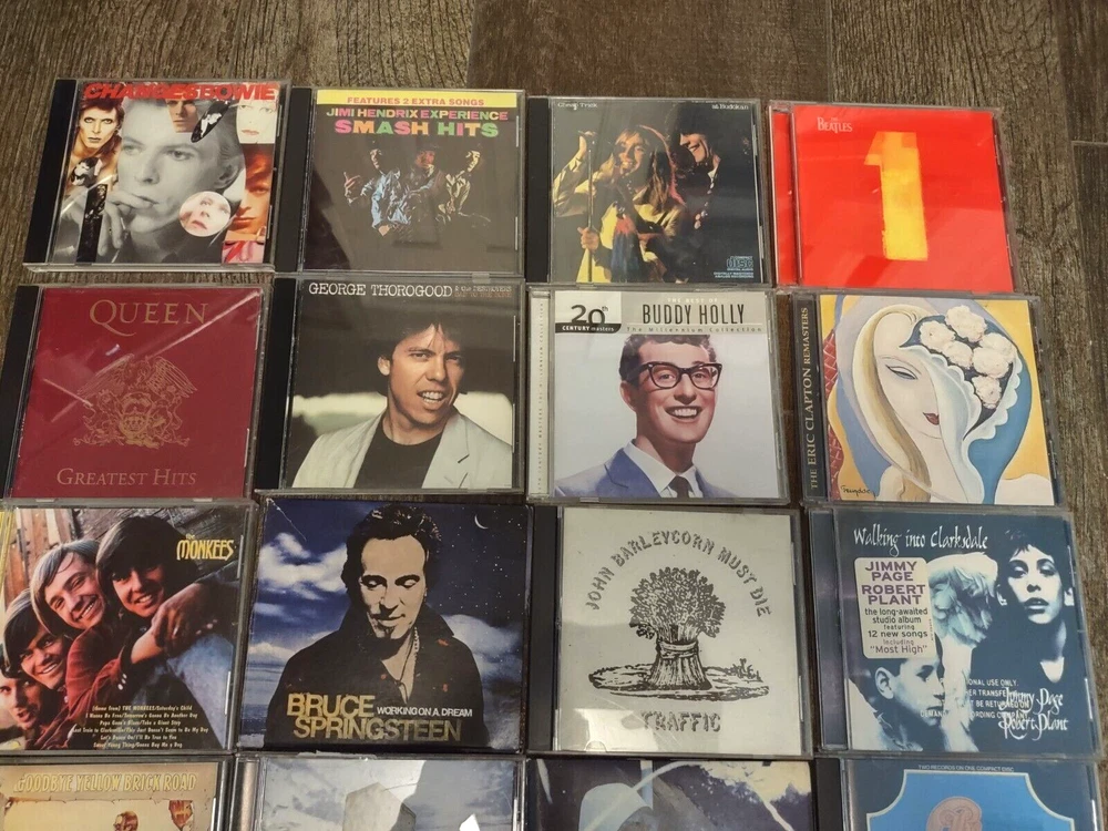 20 release CD lot includes: Jimi Hendrix - Smash Hits" 1972 Reprise 075992723824 Derek & The Dominos "Laya & Other Assorted LOve Songs" 1970 Polygram UPC 731453182028 The Beatles "1" 2000 Capitol / Apple Records UPC 724352932528 The Doobie Brothers – "Takin' It To The Streets", 1976, Warner Bros, 081227991241 Queen – "Greatest Hits", 1992, Hollywood Records, 720616126528 David Bowie - "ChangesBowie" 1980, RykoDisc, Music Club version Bruce Springsteen – "Working On A Dream", Columbia, 886974135524 Cheap Trick "At Budokan" EPIC Records 07464357952 The Who "Who' Next" MCA 008811126926 Traffic "John Barleycorn Must Die: Island BMG Music Club edition Crosby Stills & Nash "Crosby Stills & Nash" Atlantic 075678265129 Elton John "Goodbye Yellow Brick Road" Polydor 020831471060 (Columbia House Record Club version) Jimmy Page & Robert Plant – "Walking Into Clarksdale", 1998, Atlantic Records, 075678309229 (promotional copy) George Thorogood & The Destroyers – "Bad To The Bone", 1982, EMI/Manhattan, 077774608329 Robbie Robertson – "How To Become Clairvoyant", 2011, 429 Records, 795041782120 Monkees - "The Monkees" 1994 Rhino 0208311027223 Columbia House Record club version Sting - "Ten Summoner's Tales", 1993, A&M Records (No art work - CD in case only) Chicago - "Chicago Transit Authority" 1969 Chicago Records 703404300126 Doors - "Soft Parade" 1975 Elektra Records 075596067323 Buddy Holly - The Best of 20th Century Masters 1999 MCA Records 008811195625