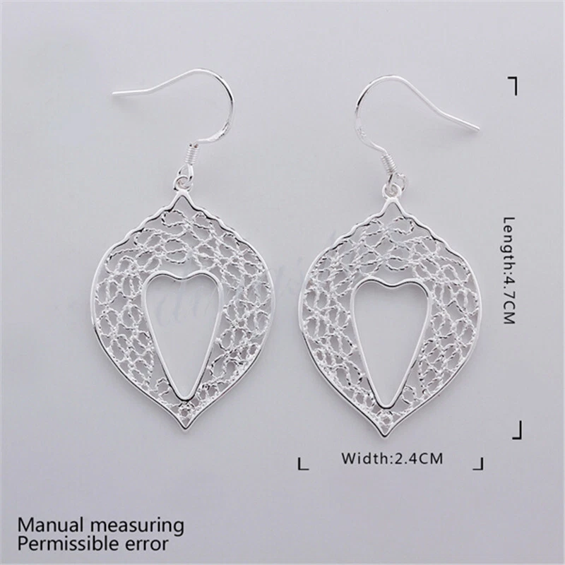 Product Description: This listing is for one pair of classic solid 925 sterling silver filligree leaf open heart dangle earrings. It is shiny, tarnish-free and hypoallergenic. It's a perfect piece for every situation, every day of the week. They are Hypoallergenic and tarnish-resistant. It does not flake off, lose luster or discolor. It is covered under our 60-day 100% money-back guarantee. *** Free gift box included. Metal 925 Sterling Silver Product Dimension Including Hook: 47 mm * 24 mm (1.85*0.94 inch); excluding Hook: 32 mm * 24 mm (1.26*0.94 inch) *** Please always refer to the description for the measurement of the product. Please do not judge the size based on the picture on your screen. The product may look larger or smaller based on your screen size. Weight 3.8 gram Main Color White Note Product SKU: H870 Shipping Policy (U.S, APO, FPO, Puerto Rico, Virgin Islands) All products will be shipped from our warehouse in Morgan Hill, California, USA For USA buyers, we will ship your order by USPS (Postal Office) First Class Mail or Priority Mail (Please make your choice when you make payment). We ship within one working day once payment received. Payments received before 1:00PM will be shipped on the same day. We ship to all address, including physical address, P.O. Box address, Puerto Rico, Virgin Islands, Guam, APO, FPO etc. International Buyers We ship worldwide. Flat Rate shipping to all countries regardless of quantity. For packages of such small size, most countries usually do not charge importing tax. However, in case there is any in importing tax, Please Note: Import duties, taxes, and charges are not included in the item price or shipping cost. These charges are the buyer's responsibility. Please check with your country's customs office to determine what these additional costs will be prior to bidding or buying. Customs fees are normally charged by the shipping company or collected when you pick the item up. These fees are not additional shipping charges. We can not guarantee the exact delivery date for international orders. Customer Service & Return Policy We care about our valued buyers, if you have any questions, our Customer Service staffs will be very glad to help you. We try our best to reply to your emails as soon as possible, however, due to high volume of daily incoming emails and time zone difference, we may not be able to reply your emails immediately. You satisfaction is always our No. 1 concern. Our success is 100% based on your satisfaction and continuous support. No matter for whatever reason, if you are not 100% satisfied, you may always return the product for refund or exchange. Please e-mail us with a brief reason before returning a package. Feedbacks Dear buyers, we appreciate your business, if you are satisfied with our product and service, please leave us a positive feedback. Your recognition will make us more confident to develop business and serve you better. Our goal is to make sure you are a happy buyer and pleasant shopping with us. Please email us before leaving any 1 or 2 ratings, negative feedback or open any dispute. We understand the concerns and frustrations you might have, and will do our endeavor to resolve the issues. Please give us the opportunity to resolve any problem. For international buyers, when you rate the shipping time part please take international transit into consideration.