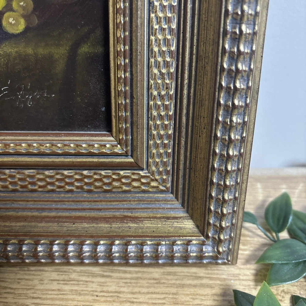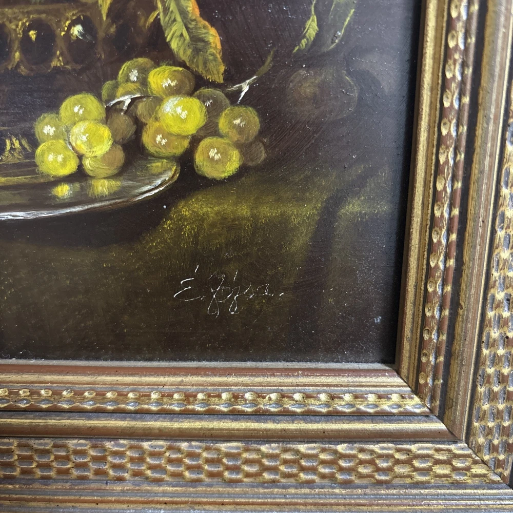 This stunning classic still life painting captures a beautifully detailed arrangement of fruit, a silver vessel, and a draped cloth, all rendered with masterful use of light and texture. The composition is both elegant and timeless, showcasing the artist’s skill in traditional still-life artistry. The artwork is signed in the lower corner, but the signature is not fully legible. Despite this, the piece exudes quality and craftsmanship, making it a wonderful addition to any art collection. Measuring 35 cm in width and 31 cm in height, the painting is framed in an ornate gold-tone frame that enhances its classic appeal. This piece is ideal for adding warmth and sophistication to living rooms, dining areas, or kitchens. We take great care to provide accurate descriptions, and we encourage you to thoroughly review the accompanying photos for a comprehensive understanding of the item's details. If you have any questions or need additional information, please don't hesitate to reach out to us.