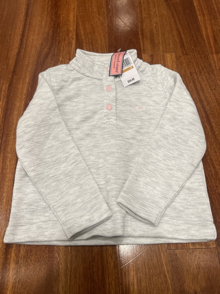Vineyard Vines Light Grey Heather Diamond Quilted Snap Girls Pullover New Tags This pullover fleece is designed for babies and toddlers and features a snap closure for easy dressing.The pullover style and quilted accents add a touch of sophistication to the overall look, making it a stylish and practical addition to any little one's wardrobe. Made with high-quality materials and brand new with tags, this pullover is sure to be a favorite for both parents and children alike. Item ships free via USPS Ground advantage sealed in a bag for protection