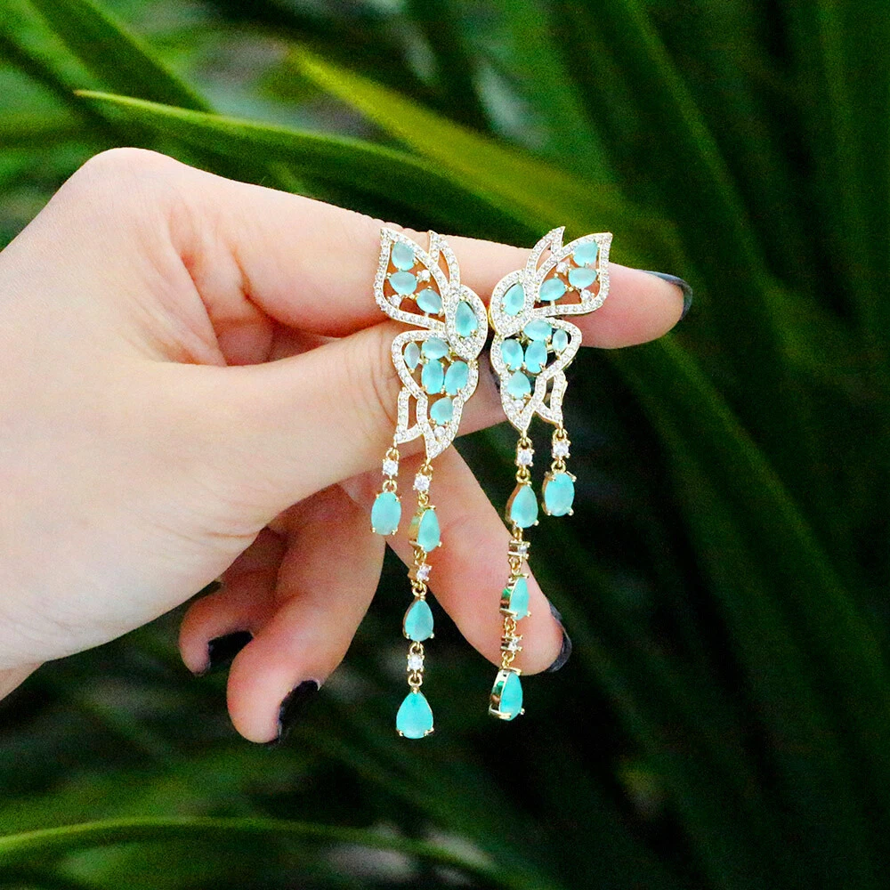 Classic Women Gold Plated Blue Zircon Butterfly Long Tassel Fringe Drop Earrings