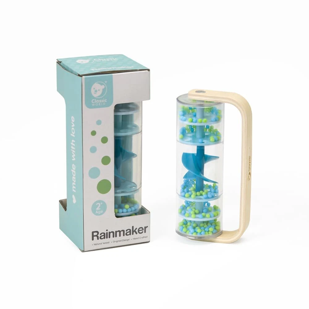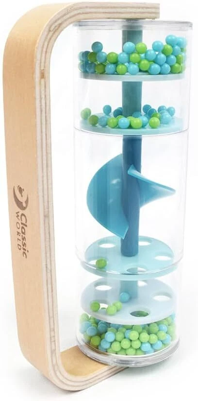 Further Details Title: Classic World Rainmaker - Rainmaker Baby Toy - Baby Sensory Toys - Baby Learning and Development Toys - Auditory Instrument Toy - Baby Toys for 2+ Year Olds - Ideal Christmas Stocking Filler, Blue Green, Blue Condition: New Brand: Classic World Color: Green, Blue Material: Wood Type: Early Development & Activity Toys Number of Items: 1 Item Weight: 0.14 Kilogramsg Theme: Fantasy Description: PRODUKTBESCHREIBUNGEN Schütteln, drehen und rollen Sie diesen blauen Regenmacher von Classic World. Sie können sehen, wie die Perlen von oben nach unten fallen und ein schönes Regentropfengeräusch erzeugen. Holzspielzeug von Classic World unterstützt solch fantasievolles Spielen. Wie Einstein sagte: „Phantasie ist alles. Sie ist die Vorschau auf die kommenden Attraktionen des Lebens. Fantasie ist wichtiger als Wissen.“ Die Spielzeuge von Classic World werden ohne schädliche Behandlungen in ihren Materialien und bei der Herstellung hergestellt und laden zu einer natürlichen Einführung in einige der Wunder der neuen Welt ein. Ein beruhigender Kontakt mit massivem und nachhaltigem Holz, nichts anderes fühlt sich so an; alle verschiedenen Farben und Konfigurationen regen die grenzenlose Fantasie Ihres Kindes an. Viel Spaß beim Spielen, viel Spaß beim Lernen. Dimensions: 14,5 x 7 x 4,5 cm; 140 Gramm Item Length: 145mm Item Width: 70mm Item Height: 45mm MPN: 40528 IMPROVES MOTOR SKILLS: Our baby rainmaker is an excellent tool for developing a musical ear and ability. It enhances coordination, observation, concentration, and fine motor skills. This educational toy promotes sensory exploration and helps toddlers improve their dexterity and hand-eye coordination, making it a valuable addition to any collection of developmental toys. VIBRANT SOUNDS: The rhythm of the cascading beads inside the rainmaker baby toy is controlled by the pace at which your child twists the rattle. The vibrant beads within the tube create a sound that mimics rain, providing a sensory experience that captivates and delights. This sensory toy for toddlers offers a unique way to explore sounds and rhythms through play. FULL OF ENTERTAINMENT: The baby rattle is filled with multiple beads and various propeller spinners that produce different sounds when shaken, twirled, or rolled. This sensory toy offers a dynamic play experience that stimulates auditory and visual senses. It's a perfect toddler learning toy that encourages creative play and keeps children engaged for hours. CLASSIC WORLD TOYS: At Classic World Toys, we aim to bring children closer to nature and inspire their imaginations through play. Our rainmaker baby toy is designed to provide wonder and joy, fostering exploration and learning. This educational gift for kids is ideal for sensory play activities, making it a thoughtful and fun toy that supports early childhood development and learning. EASY GRIP: Our rainmaker baby toy is designed for small hands, with dimensions of 6.5 cm wide and 16 cm long. The sturdy wooden handle ensures durability and safety, making it the ideal early learning toy for discovering colors, noises, and movement. This sensory toy is engaging and entertaining for your child, offering endless fun without the worry of it breaking. Missing Information? Please contact us if any details are missing and where possible we will add the information to our listing.