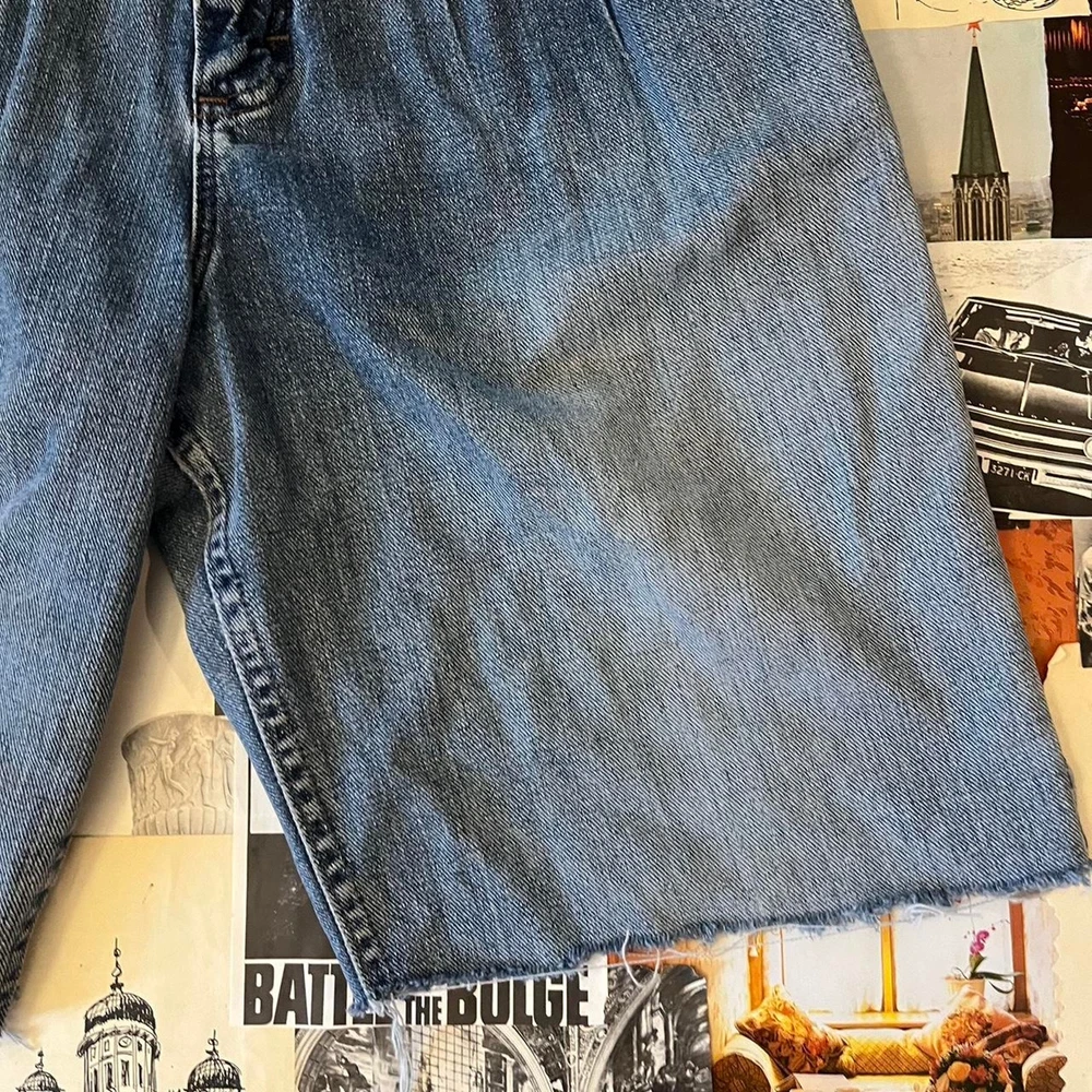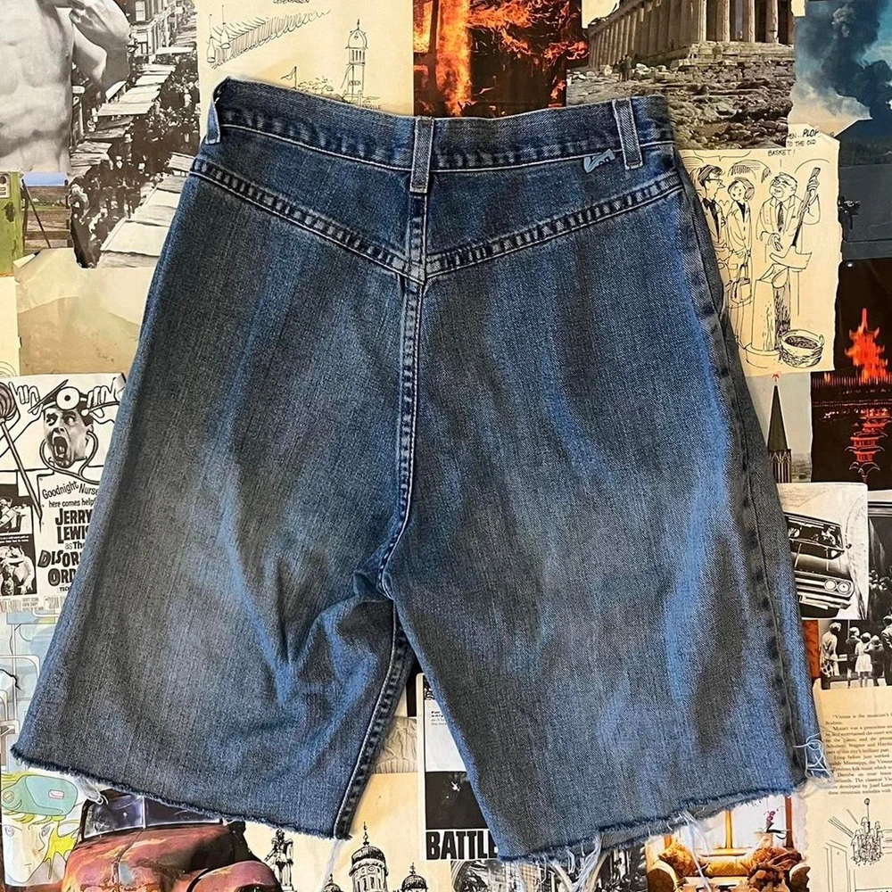 classic y2k denim jorts kind of dark wash going to light wash down the leg distressing at the bottom hems in pretty great condition simple yet great for making different outfits with y2k vintage retro 2000s preppy trendy timeless old school streetwear skate skater drip indie retro y2k tee baggy urban old school
