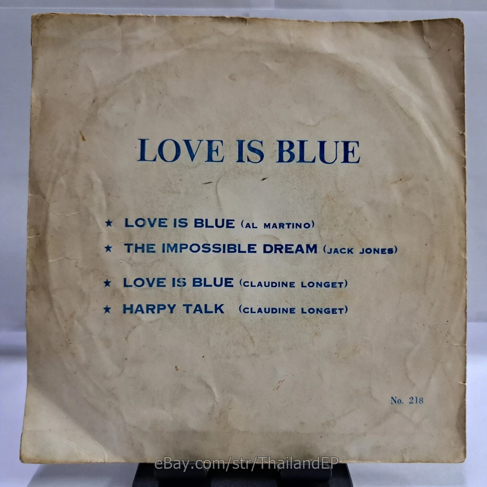 Welcome to The World of ""Thailand Vinyl Records"".Very rare and beutiful picture of cover. Check everyday . This item is for a true 7" single collector. It was printed and sold locally as limited EP back in the early 70's. Only few copies were spread outside Thailand. Most professional record collectors know that it is scarce nowadays and is absolutely a collector's item. If you know a UK magazine called RECORD COLLECTOR then you must have read many articles mentioning THAILAND EP and this is it !!! Here is your chance to own one-of-a-kind piece of Asian's 7" single history. Description Records !!! DETAIL SONG and ARTIST !!! Side A: A1 = Al Martino - Love Is Blue / A2 = Jack Jones - The Impossible Dream Side B: B1 = Claudine Longet - Love Is Blue / B2 = Claudine Longet - Harpy Talk Label&Catalogue number : : TK218 Country of release : THAILAND Condition (Sleeve/Disc) : Poor / VG+ and pls see picture too. Shipping I am seller in Thailand not USA.So I can not ship 4$ as policy pls understand this real rate from oversea . Price for shipping(Airmail )&Packaging to worldwide only US 14.99 USD .Except Asia and JAPAN only 14.99 USD. You can save cost for combine shipping only 3 USD$ per each. 2xEP=17.99 USD$ , 3xEP=20.99 USD$ . My package very safety by big cardboard don't worry about your's EP/PS/LP. Time delivered 21-45 days . ***All item : have tracking system no need add money*** **For normal shipping (Airmail).Time delivery to ITALY maybe use 1-2 Months, France use 1-2 Months.But Don't worry item will arrived to you sure!!.For fastest and High value you can use Express Mail Service cost for1 EP =39 USD.EP will arrived to you within 5-7 Days. ***All shipment have fully tracking system *** Payment PAYMENT : I accept the follow payment by eBay managed , . My ID eBay provide by eBay .Account will be provide at the end auction.Charges to be covered by winner. If you have question pls email to me anytime i can answer immediatly. I have many EP,PS 7" Thailand Pls Click => View seller's other items Check my feedback , I care and honest all customer.I welcome 0 feedback but contact me first if you will bidding. Good Luck !!!! and Enjoy . 45 RPM / EP/ LP Grading Scale: Mint /NM/ Excellent(VG++) /VG+/ VG /G+ /Good(G) / Fair / Poor / Bad (According Record Collector Magazine (UK)) LOT150-08TK218