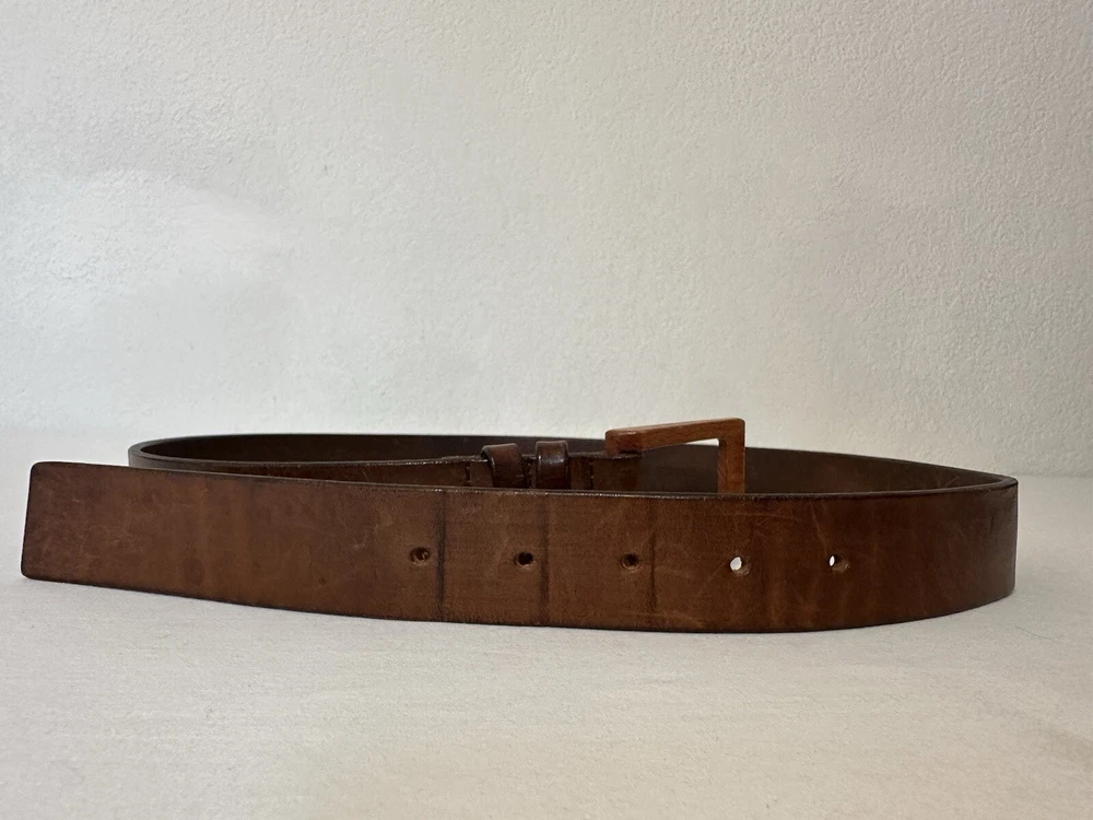 Claudio Orciani Brown Leather Belt Leather Wooden Buckle Italy 2031 43” Good Normal Wear Light Scuffs One Water Mark Lines On Leather From Buckle SEE PICTURES FOR CONDITION Measures 43”