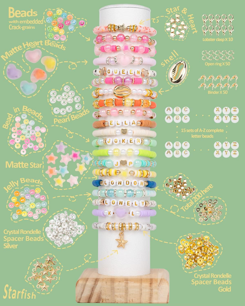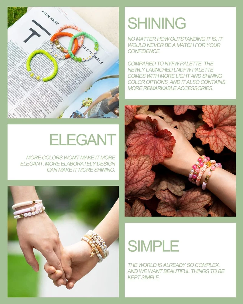 📿 【BE AN UNIQUE JEWELRY DESIGNER】 - Color schemes of our bracelet making kit comes from The Classic Spring/Summer LNDFW Color Palette, and we added Very Peri——the color of year. This version also includes 8 novel speckled beads. If you are fashion icons, if you want to develop sense of fashion, this clay bead bracelet kit is the most optimal option. Instead of randomly pick some colors, our color selections are always trendy and in the front of fashion. 💙【WITH MORE SHINING ELEMENTS, THE SET HAS MORE FASHIONABLE SENSE】- Deinduser beads for bracelets come with more remarkable accessories, like pearl beads, jelly beads, crystal rondelle spacer beads, crack beads. These clay beads allow you to create Ornately Urban style's elegant jewelries. 📝【EVERYTHING YOU NEED INCLUDE 】 - This jewelry making kit includes 4800 pcs polymer clay beads in 24 colors, 400 pcs(15 sets of A-Z) alphabet beads, 100 pcs crystal rondelle spacer beads, 6 sets ear wire and hoop, 15 pcs golden stars, 15 pcs golden hearts, 10 pcs golden starfishes, 5 pcs golden shells, 10 pcs matte star beads.... It’s too much to write one by one, and everything shown on the picture contains. 👨👩👧👦 【NOT ONLY A BRACELET MAKING KIT】- With these beads for jewelry making, you can enjoy crafting during the holidays, inspire your creativity and imagination, The 24 color bracelet beads for jewelry making kit are enough to make 40-50 bracelets and necklaces, which is a cute gift for your party. 📿【WHAT'S NEW THIS TIME?】- If NYFW palette is a reflection of Morandi,then the newly launched LNDFW palette stands for the ornately urban style. It comes with more light and shining color options, and it also contains more remarkable accessories. Product Description We get everything ready, expected and unexpected Set includes: Heishi beads in 24 bright colors, colors come from The Classic Spring/Summer LNDFW Color Palette 8 novel speckled beads 10 sets Lobster clasp, 50 pcs open ring and 50 pcs binder 6 pcs ear hoops and 6 pcs ear wire 50 pcs flat disc spacer beads and 50 pcs flower beads 50 pcs square beads and 50 pcs round beads 100 pcs crystal rondelle spacer beads (50 pcs gold + 50 pcs silver) 5 pcs matte heart beads and 10 pcs matte star beads 50 pcs pearl beads, 15 golden star and 15 golden heart 20 pcs crack beads, 20 pcs bead in beads and 20 pcs jelly beads 400 pcs(15 sets of A-Z) alphabet beads, no missing letters. 5 pcs golden shells and 10 pcs starfish 2 rolls of 32.8 ft elastic cords + a scissors 2 Storage Boxes It’s a little expensive but definitely worth it It is always a headache selecting the right gift Necklace,earring, or bracelet? Your special one may not be surprised by your present Why not surprise her with a jewelry DIY set, she has that perfect jewelry in mind. Make an exclusive jewelry for someone you care with Deinduser clay beads set, or send her a set as present Exclusiveness and uniqueness make a gift precious What's new this time? If NYFW palette is a reflection of Morandi,then the newly launched LNDFW palette stands for the ornately urban style. It comes with more light and shining color options, and it also contains more remarkable accessories. Exclusive offering with 7 shining elements! Make your Jewelry Making kit special 400 letter beads, from A to Z, give your gifts exclusive meaning Ear wires and ear hoops are provided, now you can make earrings Considering that you might get it as a gift, we packed it in a cute cardboard box Gift Wrap Available, Offering Can Be Gift Messaged All jewelry shown in picture is made from this kit, can't wait to see your creations