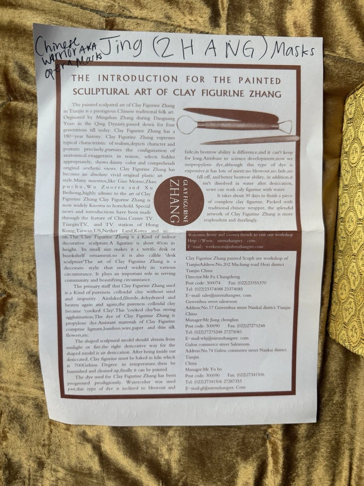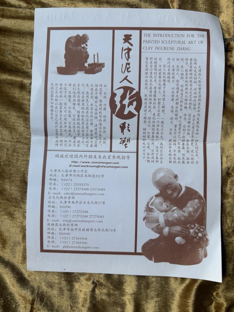 🎨 Clay Figurine Zhang – Hand-Painted Sculptural Art from Tianjin, China πŸ‡¨πŸ‡³ A Legacy of Over 180 Years of Folk Art Excellence Clay Figurine Zhang is a renowned form of traditional Chinese folk art that originated in Tianjin during the Daoguang reign of the Qing Dynasty. First created by master sculptor Zhang Mingshan, this art form has been passed down through four generations and is celebrated today as one of China’s most iconic sculptural traditions. Each figure is crafted from highly purified, sand-free clay, which undergoes a meticulous process of filtering, dehydrating, and repeated beating until it becomes a smooth, adhesive-rich medium known as β€œcooked clay.” Once shaped, each figurine is air-dried, kiln-fired at 700Β°C, and then hand-painted with vibrant, fade-resistant propylene dyes that are waterproof and long-lasting. πŸ–ŒοΈ Artistic Highlights: β€’ Exquisite realism blended with stylized exaggeration for emotional expression β€’ Detailed hand-painting with fine brushwork and traditional color palettes β€’ Use of mixed media including silk flowers, paper, bamboo, and fine wire β€’ Each piece takes up to 30 days to complete β€’ Often represents historical, cultural, or folkloric characters πŸ“ Approximate Size: 40 cm (15.7 in) tall Type: Indoor decorative sculpture / β€œdesk sculpture” Display Use: Ideal for bookshelves, display cabinets, and home altars πŸ–ΌοΈ Cultural Recognition: This art form has been widely featured in Chinese and international media, including CCTV and television stations across the U.S., Taiwan, Hong Kong, Korea, and the Netherlands. Esteemed artists such as Xu Beihong, Zhao Puchu, and Guo Moruo have publicly praised Clay Figurine Zhang for its artistry and cultural value. πŸ’Œ I’m open to offers β€” feel free to message me with your best!