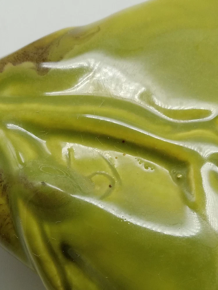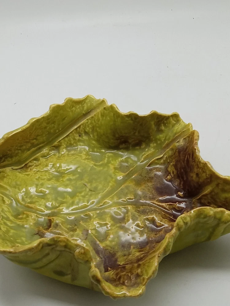 This beautiful decorative bowl features a leaf pattern on its surface, with realistic browns and greens. The bowl is made of clay and has a nice glaze. It's perfect for storing small trinkets, candy, or nuts, and would be a great addition to any collection. The bowl is unmarked and its origin is unknown, but its handmade production style and pottery technique give it a unique character. The set includes one bowl and its backstamp reads 61 or 19 (unclear). Don't miss the chance to own this beautiful piece of art pottery, which will add a touch of natural beauty to any space. 10.5 inch long 7 inch wide 2 inch deep Unique