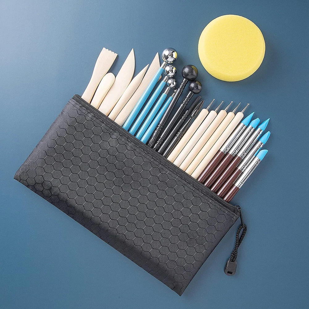 Useful Tools: Polymer clay tools kits are the art of shaping, casting, molding, modeling, painting, dotting, sculpting or carving a mold-able material, for air dry clay, polymer clay, modeling clay, pottery clay, molding clay and ceramics, which can also be used with polymer clay cutters. And our 25 different clay sculpting tools will provide various carving shape to make your designs more flexible and are suitable for beginners and experts Excellent Quality: Clay sculpting tools are made of excellent quality metal head, wooden handle, and plastic. They are sturdy and timeproof. They are sensible for pottery craft, nail, rock, blending, drawing, smoothing, and cleaning Nice Souvenir: Our clay tools sculpting set is a great idea to surround yourself with reference of real life and other inspiring art. And air-dry clay tools are sensible holiday and birthday goods for your family members, kids, adults, friends, students, and any aspiring artist in your life at birthday, holiday, and so on Package Includes: You will receive a complete kit of clay tool, including 5 wooden carving/shaping tools, 5 wooden handle ball stylus, 5 silicone clay sculpting tools, 4 rubber handle ball stylus, 4 plastic stylus, 1 pottery sponge in a black storage bag Important: If it is a present for a minor, please stay with them while they use it to avoid unnecessary trouble Product Description Package includes 5 Wooden Clay Tools 5 Wooden Handle Ball Stylus 5 Rubber Pens 4 Rubber Handle Ball Stylus 4 Plastic Stylus 1 Pottery Sponge 1 Black Storage Bag Excellent Quality and Nice Souvenir Our polymer clay tools kits are the art of shaping, casting, molding, modeling, painting, dotting, sculpting, or carving a mold-able material, for air dry clay, polymer clay, modeling clay, pottery clay, molding clay And our 25 different clay sculpting tools will provide various carving shape to make your designs more flexible and are suitable for beginners and experts Our clay tools sculpting set is a great idea to surround yourself with reference of real life and other inspiring art. And air-dry clay tools are nice holiday and birthday goods for your family members, kids, adults, friends, students, and any aspiring artist in your life at birthday, holiday, and so on CAUTION: The metal and wooden heads are very sharp, so please be careful to keep them away from children, or these tools should be used under the supervision of adult