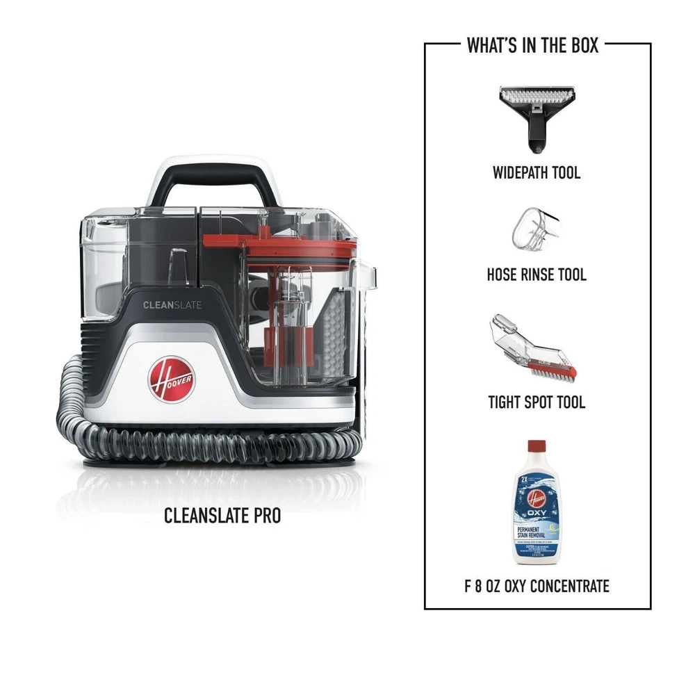 Product details Unplanned messes? No problem. The CleanSlate Carpet and Upholstery Pet Spot Cleaner, FH14050, combines powerful suction, versatile tools, and the performance of the Oxy Formula to permanently remove stains and messes. With our 7" WidePath Tool for large areas like stairs and the TightSpot Tool for crevices and tough to reach areas, you'll have the flexibility you need to clean messes of any size. Quickly remove spills and stains on the go thanks to a light, portable design and a long cord so you can easily move between areas. And with the Hose Rinse Tool, your machine stays clean and ready for the next mess. Clean with complete confidence! POWERFUL SUCTION: For life size spots & stains TOOLS FOR EVERY MESS: With the 7” WidePath Tool for large areas like stairs and the TightSpot Tool for crevices and tough to reach areas QUICKLY REMOVE: Spills, stains, and set-in messes, offering powerful suction and the tools you need for any job, large or small CLEAN TOUGH MESSES: Mud, wine, pet messes and more from carpets and upholstery EASY TO CLEAN: The Hose Rinse Tool flushes the machine with water to remove any left behind dirt & debris DUAL TANK SYSTEM: 40 oz clean solution capacity so you can clean farther while clean water and dirty water stay separate TACKLES STAIRS & LARGER MESSES: In fewer passes with the 7” WidePath Tool TIGHT SPOT TOOL: Clean crevices, corners, baseboards and other tough to reach areas WHAT'S INCLUDED: 7" WidePath Tool, TightSpot Tool, Hose Rinse Tool, trial size carpet cleaning solution Assembled Product Dimensions (L x W x H) 14.12 x 11.38 x 13.50 Inches