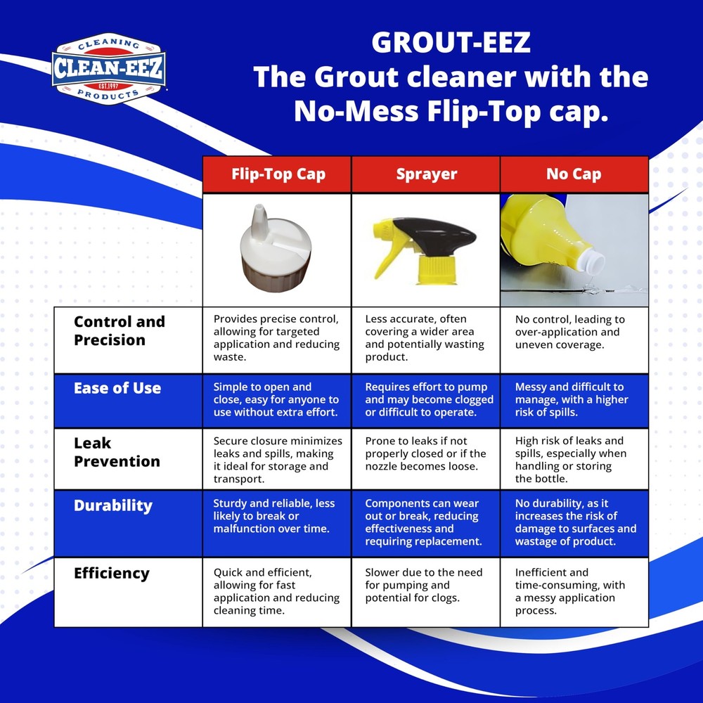 Transform your grout and tile surfaces with Clean-eez, the ultimate grout cleaner. Say goodbye to years of dirt and grime frustration with this professional-grade cleaner that effortlessly revitalizes your grout, delivering remarkable results and restoring its original appearance. No need for costly renovations; Clean-eez offers vibrant grout renewal that saves you time, money, and hassle. Plus, our innovative handheld brush, tailored for showers and tight spots, makes cleaning a breeze with v-shaped bristles and an ergonomic handle. Don't settle for dingy surfaces – choose Clean-eez for a fresh, brand-new look in your bathroom or kitchen. Powerful Grout Cleaning: Experience the ultimate solution with Clean-eez! Our professional-grade cleaner effortlessly removes years of dirt and grime from grout, ensuring frustration-free cleaning without compromise. 2-in-1 Cleaning Marvel: Transform both your tiles and grout to their original glory with Clean-eez's all-in-one cleaner. Say goodbye to dingy surfaces and hello to a fresh, brand-new look that'll leave you amazed! Remarkable Grout Revival: No dirt or grime is too stubborn for Clean-eez. Our innovative formula penetrates deep, delivering remarkable results that restore your grout's pristine appearance, saving you from costly renovations. Vibrant Grout Renewal: Why replace when you can rejuvenate? Clean-eez helps you save time, money, and the hassle of renovation by breathing new life into your grout. It's the smart choice for a vibrant, clean bathroom or kitchen. Innovative Handheld Brush: Cleaning tight spots and showers has never been easier! Clean-eez comes with a specially designed handheld brush featuring v-shaped bristles and an ergonomic handle for effortless, effective cleaning. Say goodbye to scrubbing woes!