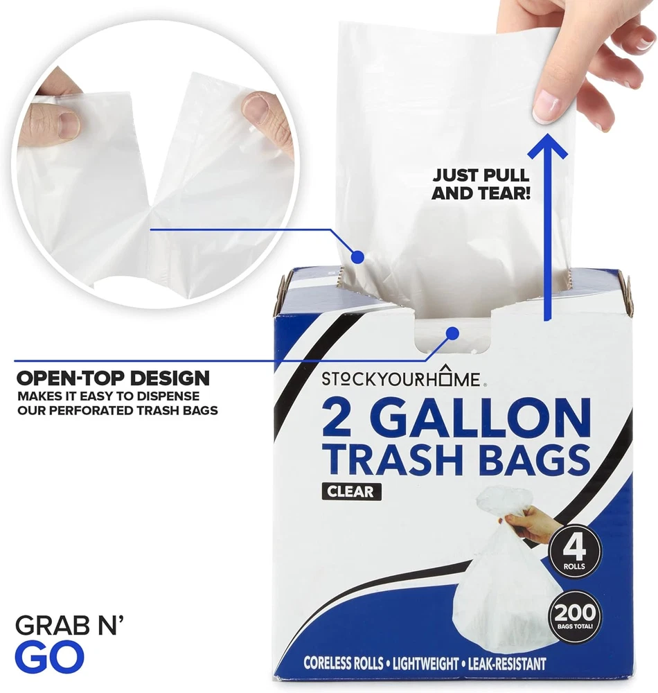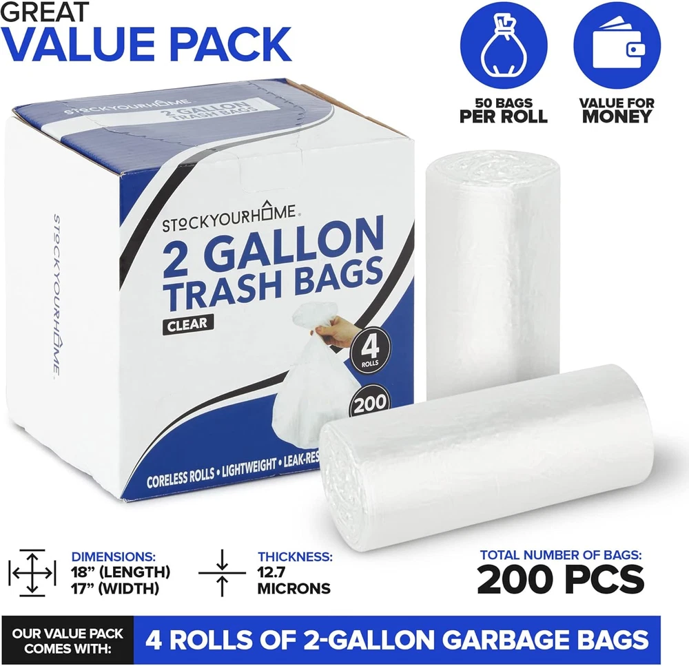 Store New Arrivals Add to Favorite View Feedback Contact Clear 2 Gallon Trash Bag (200 Pack) Un-Scented Small Garbage Bags for Bathroom Can, Mini Waste Basket Liner, Plastic Liners for Office Trashcan and Dog Poop, Bulk Household Supplies Description Item model number 1851 Item Package Quantity 200 Style 2 Gallon Capacity 2 Gallons Number of Items 1 Part Number 1851 Color Clear Net Content Weight 2.29 Pounds Material Plastic Batteries Required? No Package Dimensions 7.8 x 4.57 x 2.05 inches Item Weight 1.28 pounds Batteries Included? No Material Feature Resin Recommended Uses For Product Garbage Bags Unit Count 200.0 Count Item Form Bag Scent Unscented Size 200 Count (Pack of 1) New & Improved Quality: We've upgraded our small bathroom trash bags from 6 microns to 12.7 microns thick, making them double the strength! Our bulk 2 gal trash bags are a must for household cleaning supplies. Leak Proof: Designed with a star seal, our garbage bag protects your waste basket from unwanted liquids, leaks, and spills. Great liners for small waste bins, school bathrooms, or office trash cans. Grab-n-Go: The open-top box makes it easy to dispense our perforated mini trash bags - just pull and tear. Our coreless roll is a more sustainable choice than other small trash can liners with a cardboard center. Versatile Usage: Our multipurpose small waste basket liner can be used as produce bags for fresh fruits and vegetables, dog poop baggies, or even for arts and crafts projects. Great Value Pack: Includes 4 rolls of 2 gallon garbage bags. Each roll has 50 - that's 200 liners total! Measures approximately 18" Length, 17" Width with 12.7 Micron Thickness. Product Description Upgraded from 6 microns to 12.7 microns thick! Twice the Strength Easy to Rip Apart Dispensing Box Leak-proof Versatile Stock Your Home Bathroom Trash Bags New & Improved Quality Stock Your Home small trash bags are a must-have for any household or office. Now made with 12.7 microns, our mini garbage bag is now double the thickness , providing extra strength for enhanced durability. Made from high-density resin, our clear waste basket liners make it easy to see the contents for recycling. Comes in an easy dispensing box design, that's tiny and compact to help save storage space. Available in 2 and 4 gallon sizes - perfect for typical office or bathroom bins. View all our pack sizes below Grab-n-Go The open-top box makes it easy to dispense our perforated trash bags - just pull n' tear. Leak Proof Our garbage bag protects your waste basket from unwanted liquids, leaks, and spills. Versatile Usage Use as produce bags, dog poop baggies, or even for arts and crafts projects. Browse our Products! ABOUT US We offer the best prices around on high quality products. Our E-store includes media such as books, movies, music and games while offering electronics, toys, sporting apparel, clothing, tools, general home, garden items and more. SHIPPING We are always working hard to ensure your package arrives as soon as possible. Please understand that some factors like weather, high postal traffic, and the performance of shipping companies are outside of our control. We offer free shipping to the lower 48 states and ship within 2 business days of payment, usually sooner. We do not accept P.O. Boxes. Please provide a physical address. For shipping outside of the continental USA, we only use eBay's Global Shipping Program.The item is shipped to KY and then sent to the rest of the world. International customers are responsible for all duties and taxes. Continue to check out in order to calculate costs for shipping the item to your country. Messages regarding eBay's Global Shipping Program MUST be directed at eBay EXCLUSIVELY. RETURNS We offer a 30-Day Return Policy on items which you are not completely satisfied with. You have the option for a full-refund or an exchange of the item. No returns are available on items shipped outside of the USA. PAYMENT We accept PayPal. CONTACT US This page content is yet to come Please ad us to your favorite seller and visit again later Thank You CUSTOMER SATISFACTION We try our very best to make sure every customer is completely satisfied. If there's a problem, message us! We're happy to help. WE ACCEPT Copyright © 2021 AutoDS. | All Rights Reserved