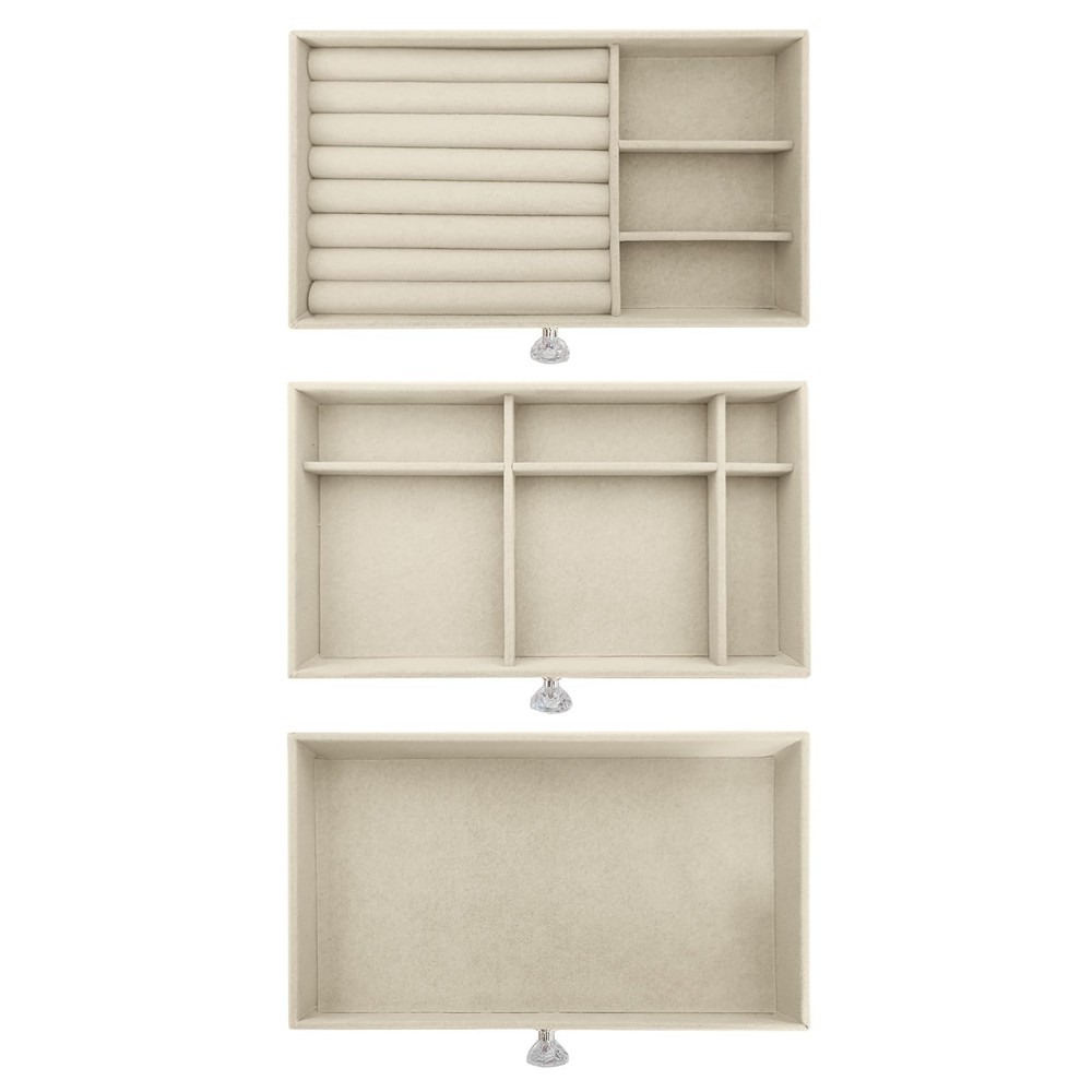Acrylic storage box dimension is 9.5″ x 5.5″ x 4.5″. It is made with crystal-clear material and velvet lining, keeps your cherished jewelry dust-free, and it's easy to clear the box with the damp cloth.velvet tray make Jewelry box stylish look and provide your jewelry better protection. Velvet jewelry box with 3 layer drawers, each drawer attached with a diamond-like handle that slide out smoothly. Top layer has 8 slots to hold rings and earrings and 3 grid for some small jewelry. Middle layer possess 6 different section for different storage meet. And the bottom drawer with no divider can contain some big jewelry or Medallions. This Jewelry box can rearrange the drawers and trays according to your needs, DIY the space you need with the adjustable dividers in compartments, the velvet trays drawers also can be took out for use independently. Clear Acrylic Organizer is the best jewelry box to storage your jewelry and also a cosmetic storage box. So It is great gift for girls or fashion lover in your life. It can hold a lot of accessory and jewelry like rings, ear studs, necklace, pendants, bracelets, cufflinks, brooches, coins and so on. You will leads your small jewelry in order and easy to find.