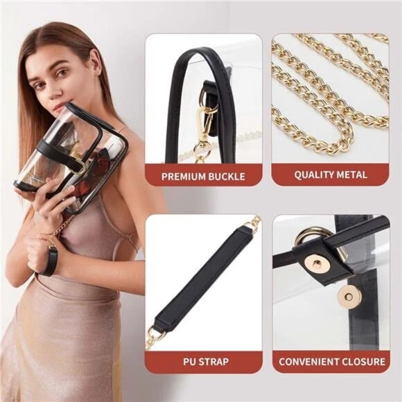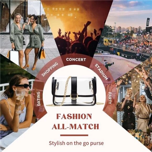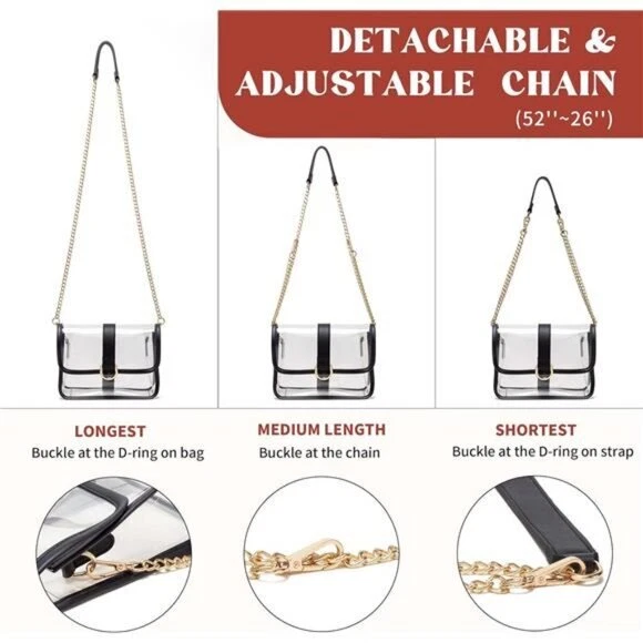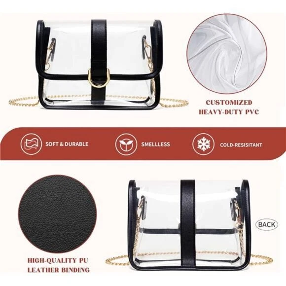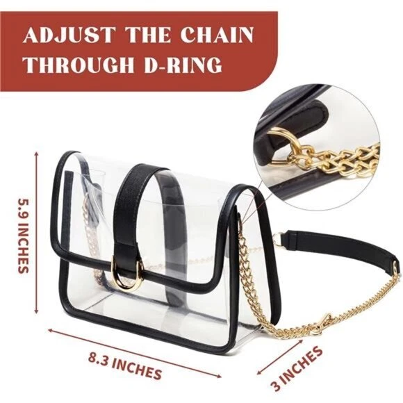 NEW! - Leather - Clear purse stadium approved: Measures 8.3x5.9x3 inches; this stylish small clear crossbody bag is decent to hold wallet, phone, sunglasses, small makeup items, perfect for where requires stadium approved clear bags such as concert, venues, festival, sport event, football games, etc. And it is a stylish on the go bag for quick errands for ladies. - Leather padded detachable & adjustable Chain. THANK YOU!