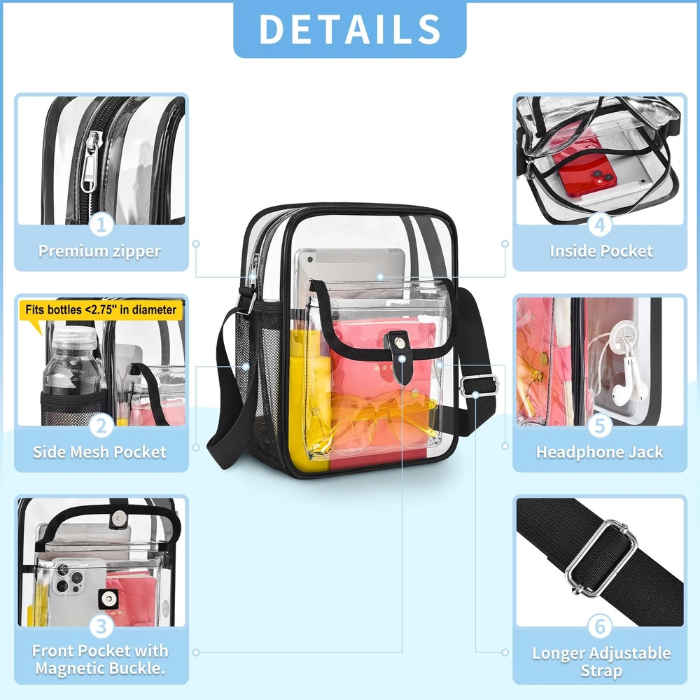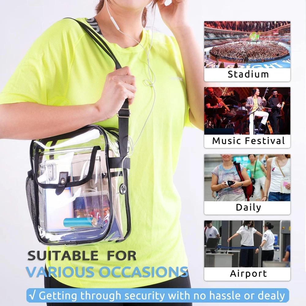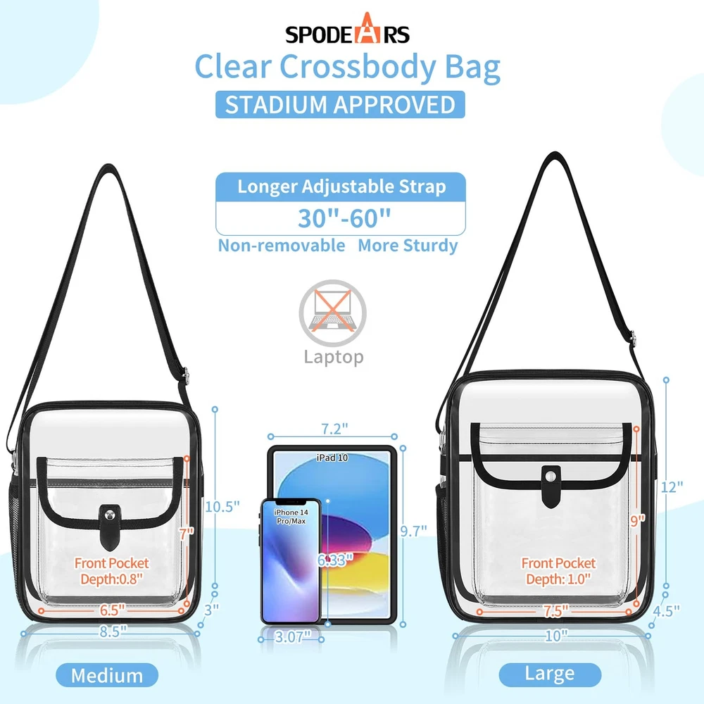 Stadium Approved: clear bags meet stadium regulations for easy entry into concerts, sports events, and more. Stay organized with quick access to your items. Comfortable & Spacious Design: Available in Medium (10.5 x 8.5 x 3 inches) and Large (12 x 10 x 4.5 inches) sizes. Features inside clear pocket, side mesh pocket, headphone jack that can double as a USB charging port, and front pocket with a magnetic closure for easy access. Durable Construction: Made of 0.4mm thick PVC plastic, tear-resistant, waterproof and easy to clean. Longer adjustable strap (30-60 inches) for all heights and body types for women and men. The non-removable strap, reinforced stitching, and premium zippers provide a sturdy structure and durability. The neutral, simple, and practical design makes it easy to match with any of your clothing. Versatile Use: transparent bag is perfect for concerts, music festivals, sports events, amusement parks, sightseeing trips, diapers, beaches, nurses, offices, daily use, and as a thoughtful gift for family and friends. Save Time and Convenience: Keep stadium bags clear with full see- through coverage, including the back. To avoid being rejected at the airport or stadium gate, carry clear tote bags smaller than 12x12x6 inches through . Verify size requirements prior to purchase.