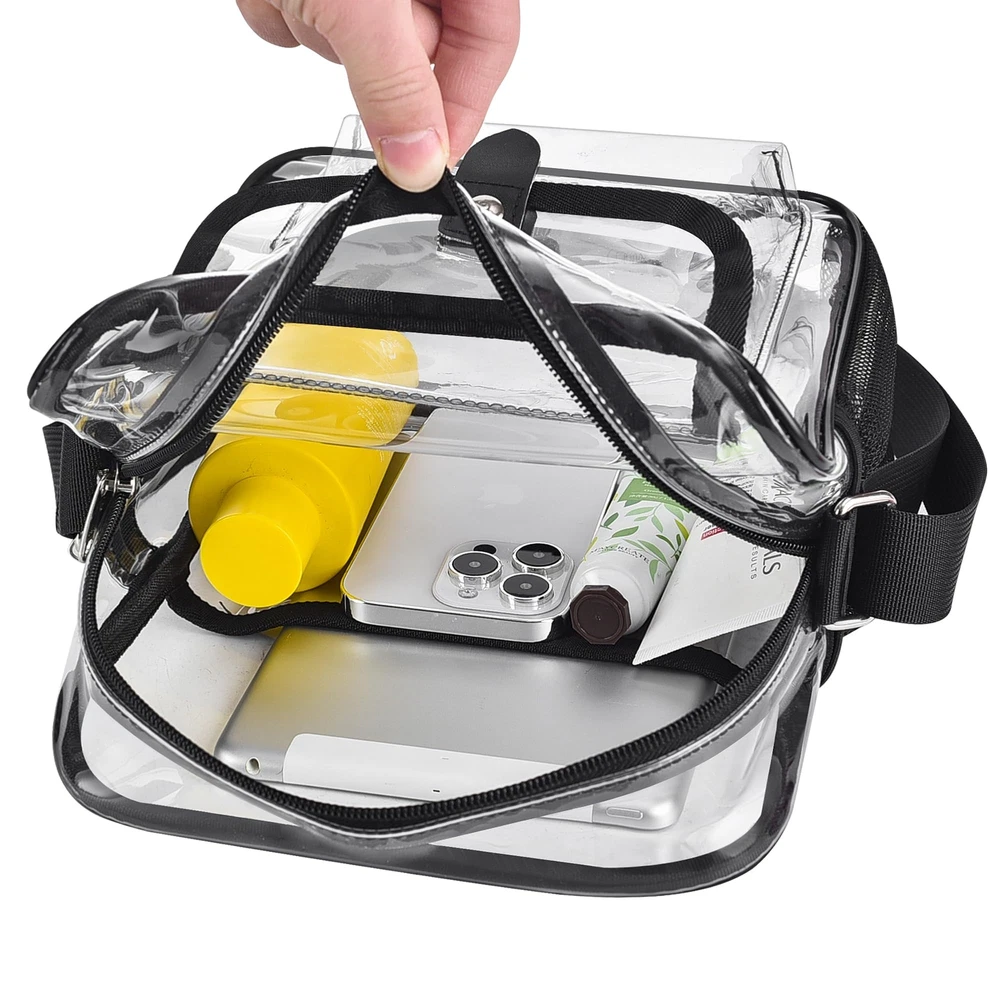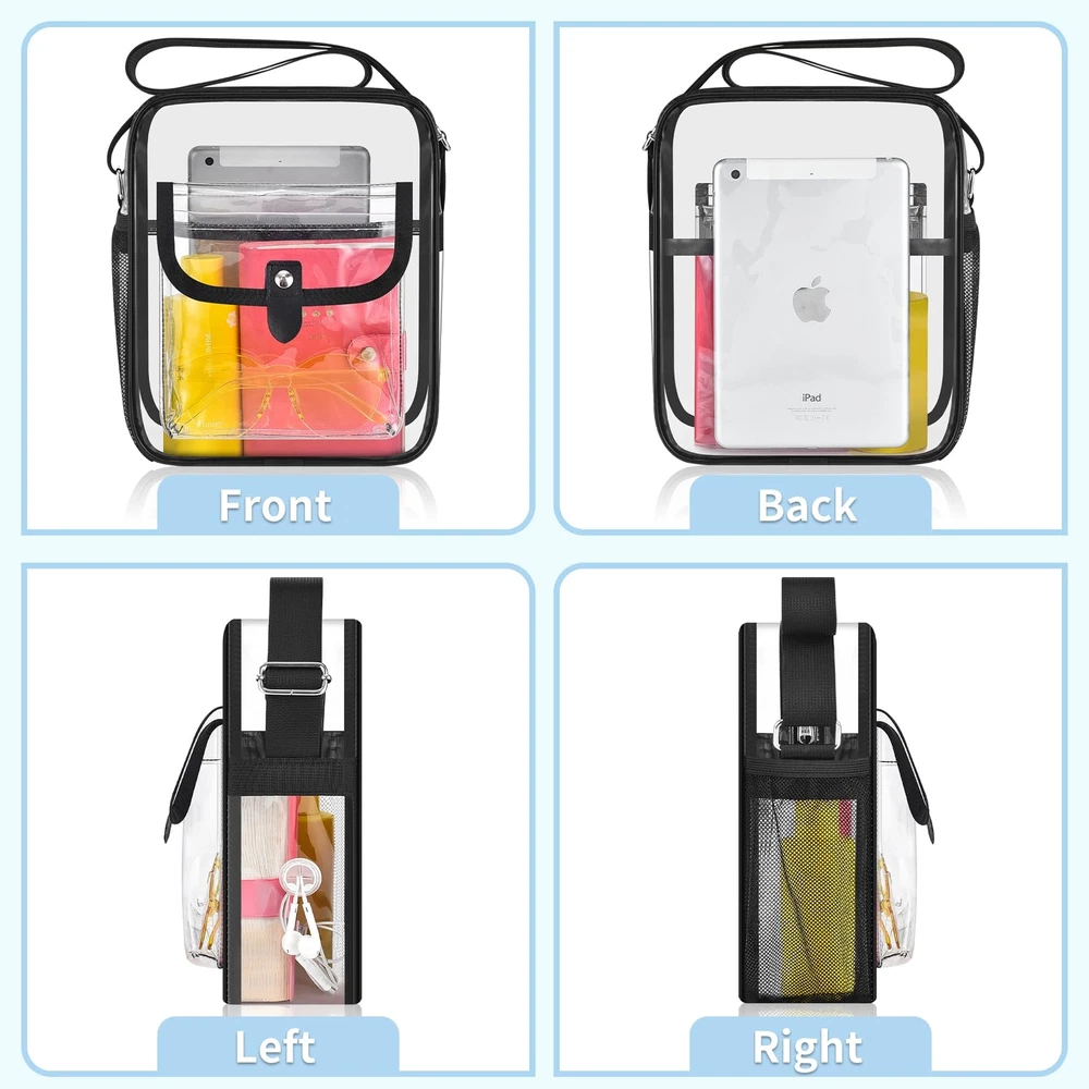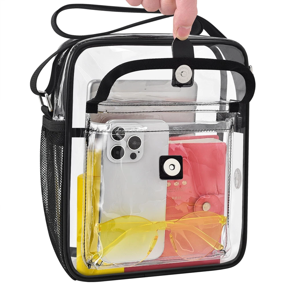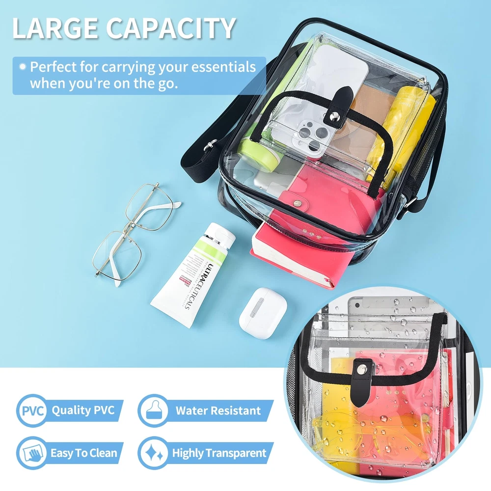 Stadium Approved: clear bags meet stadium regulations for easy entry into concerts, sports events, and more. Stay organized with quick access to your items. Comfortable & Spacious Design: Available in Medium (10.5 x 8.5 x 3 inches) and Large (12 x 10 x 4.5 inches) sizes. Features inside clear pocket, side mesh pocket, headphone jack that can double as a USB charging port, and front pocket with a magnetic closure for easy access. Durable Construction: Made of 0.4mm thick PVC plastic, tear-resistant, waterproof and easy to clean. Longer adjustable strap (30-60 inches) for all heights and body types for women and men. The non-removable strap, reinforced stitching, and premium zippers provide a sturdy structure and durability. The neutral, simple, and practical design makes it easy to match with any of your clothing. Versatile Use: transparent bag is perfect for concerts, music festivals, sports events, amusement parks, sightseeing trips, diapers, beaches, nurses, offices, daily use, and as a thoughtful gift for family and friends. Save Time and Convenience: Keep stadium bags clear with full see- through coverage, including the back. To avoid being rejected at the airport or stadium gate, carry clear tote bags smaller than 12x12x6 inches through . Verify size requirements prior to purchase.