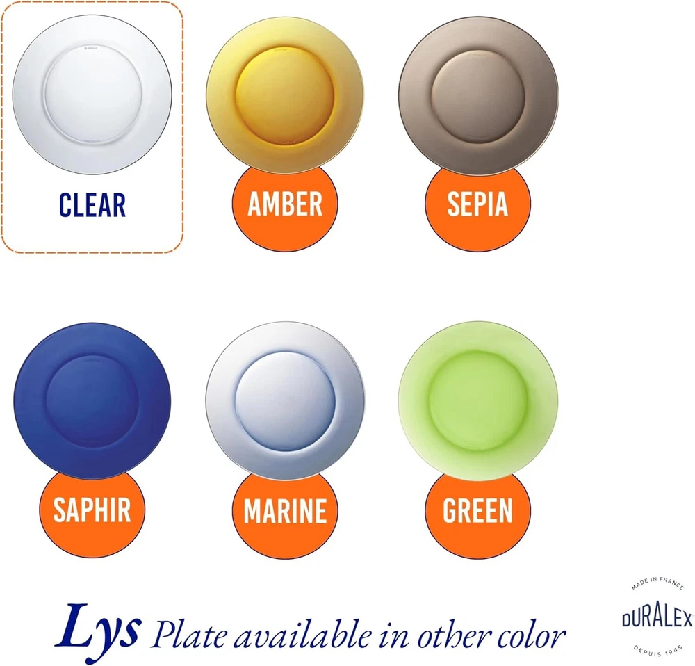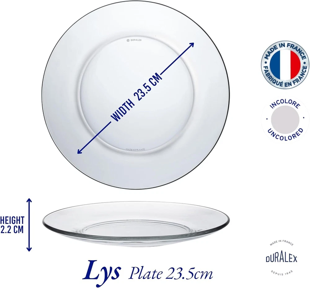 Menu Other Items Feedbacks About Us Contact Us Add To Favorites Clear Dinner Plate 23,5 Cm (9 1-4 In) Set of 6 Quality from Duralex Package: 6 plates , Diameter - 9.25 inches Material: glass, dishwasher safe Founded in 1929, Duralex has been manufacturing glassware and tabletop products in la chapelle-saint-mesmin, a city in the heart of France. Since 1939, when Duralex invented the glass tempering process, the name Duralex has been associated with resilient glassware, thanks to their proprietary tempering process. The original tempered (toughened) glasses are still in production in France and are known as the “original french tumblers.” The glassware is the perfect weight: functional yet stylish and feels extremely comfortable in the hand. They are equally suitable for cold or hot, conveniently stackable, impact and chip resistant, microwave and dishwasher safe. With the help of continuous investments and commitment to quality, Duralex has reached a level of excellence that makes its products recognized throughout the world. Duralex is and will always remain a true french manufacturer of glassware and tabletop products, and is the only glass manufacturer that makes 100-percent of their products in France. Item Specification Item model number 3006AF06D1111 Style Classic Pattern Solid Number of Pieces 6 Unit Count 6.0 Count Material Glass Package Type Custom Seasons All Seasons Is Microwaveable Yes Is Discontinued By Manufacturer No Is Dishwasher Safe Yes Item Weight 15.1 ounces Occasion All Occasion Special Feature Microwave Safe, Chip Resistant Color Clear Global Trade Identification Number 03550190401608, 23550190050091 Shape Round Recommended Uses For Product Cheese Product Dimensions 9.25"L x 9.25"W x 0.79"Th Size Large Dimensions Shipping Returns Additional Info Product Dimensions: 9.25 "th x 9.25 "th x 0.79 "th. Weight: 15.1 oz Fast shipping is very important for us. Our standard shipping service is FREE. Your order will be shipped within 1-3 business days upon full payment received. Most items are delivered within 3-5 business days, however, please allow 3-10 business days. We are shipping only to USA. We only ship to the confirmed Paypal address. We reserve the right to cancel any order for any reason at any time. We are not responsible for undeliverable addresses. We offer a 30 day return policy from checkout winning date. Your satisfaction is guaranteed! If for any reason you are unhappy with your item, just return it within 30 days for a full refund, minus shipping cost. Please contact us prior to initiating a return so that we can issue you a refund authorization. Items defective upon receipt must be packaged in their retail packaging as if new and returned with a detailed description of the problem. Return shipping fees are not refundable. We reserve the right to decline any returns if the above guidelines are not followed. All of our items, unless otherwise stated, will only run on 120 volts. Please check to make sure your country complies with these specifications. If you have a problem or question regarding your transaction please contact us before leaving any type of feedback. We will work with you to resolve any problem you may have.