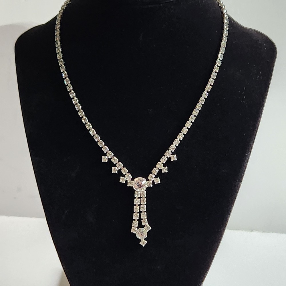 Good pre-owned condition Features- Style: Clear Drop Rhinestone Necklace Silver Tone 15 Inch Small Dainty Classic Bridal Flaws: No obvious flaws We are happy to answer any questions Color: silver clear Measurements: Length: 15" Smoke free per friendly home.. This Clear Drop Rhinestone Necklace is a classic and elegant piece perfect for weddings, engagements, anniversaries, and more special occasions. The necklace features a silver tone metal base with a Y-drop style that exudes beauty and love. The main stone, a round white/colorless rhinestone, is set in a prong setting and falls at a 15-inch length, making it a dainty and adjustable accessory for any outfit. The necklace is a timeless statement piece that captures the essence of fairytale and fantasy themes in jewelry design.