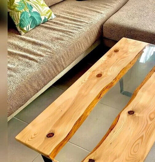 Clear Epoxy Resin Coffee Center Sofa Top, Handmade Wooden Live Edge Furniture