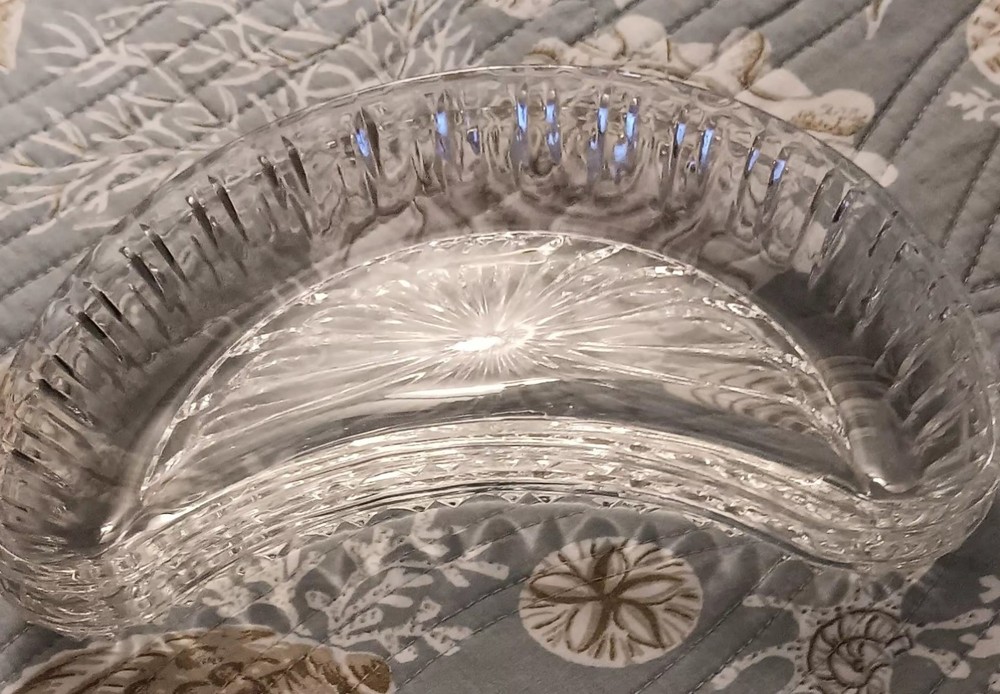 This Clear Fruit Glass Half Moon Curved Condiment Relish Nuts Side Dish Glass Set 2 features a unique and stylish design, perfect for serving condiments or snacks in a decorative manner. Made of glass with a clear color and a fruit pattern, this condiment dish has a single compartment and a curved half moon shape. The set includes 1 piece and is part of the Indian product line, manufactured in China in the 2000-2009 time period using fused glass production technique. This original vintage piece adds a touch of elegance to any table setting.