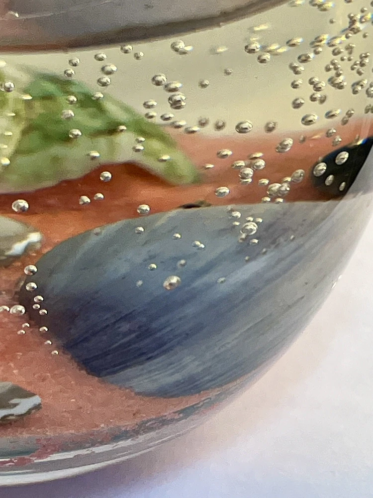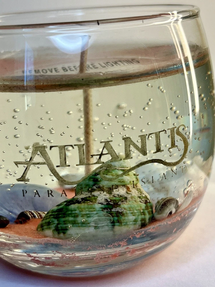 Very unique bubbled gel candle ATLANTIS Paradise Island souvenir pre-owned Unused Small globe shaped jar Measures 2.5” x 2.5” diameter Seashells and coral on pink sand Thanks for looking