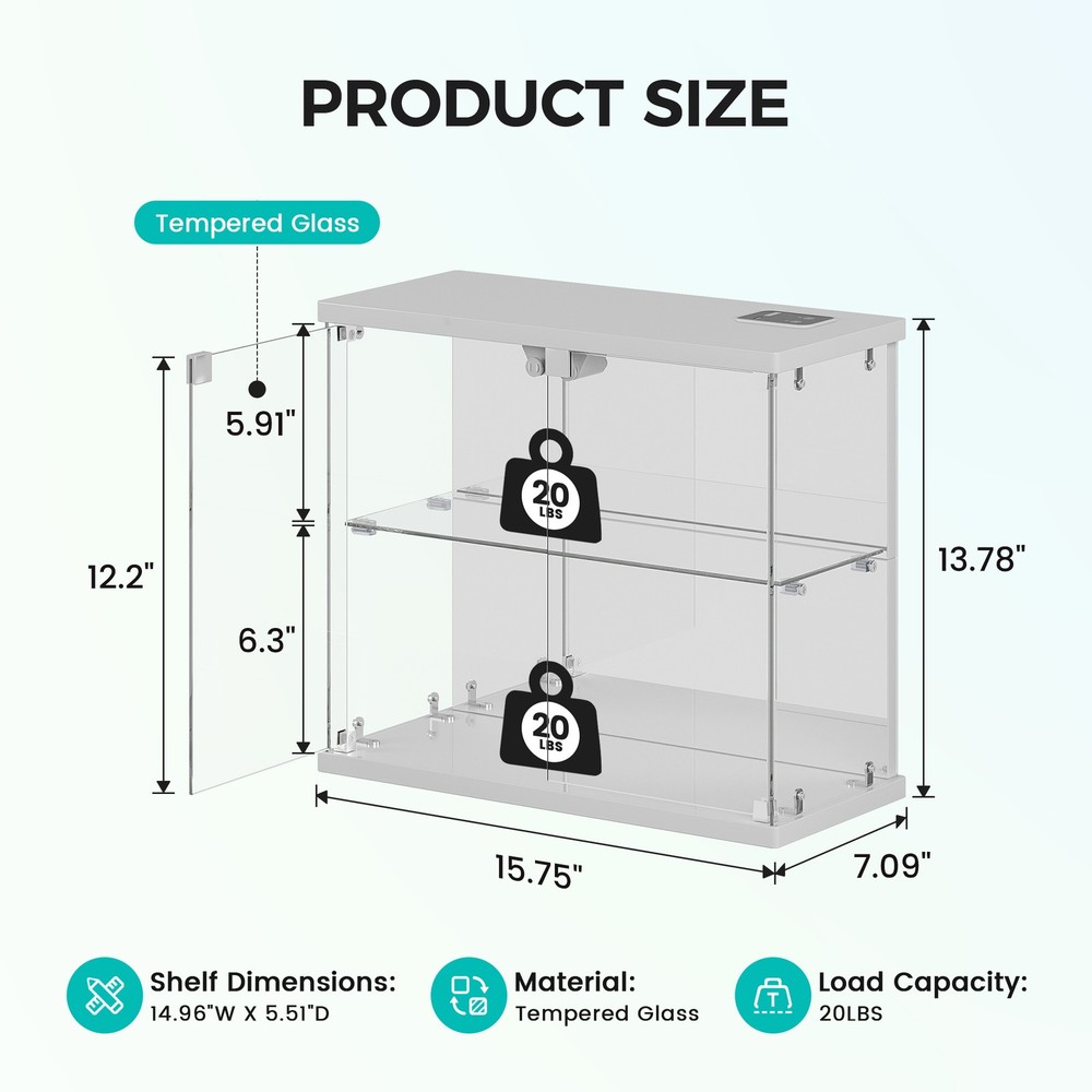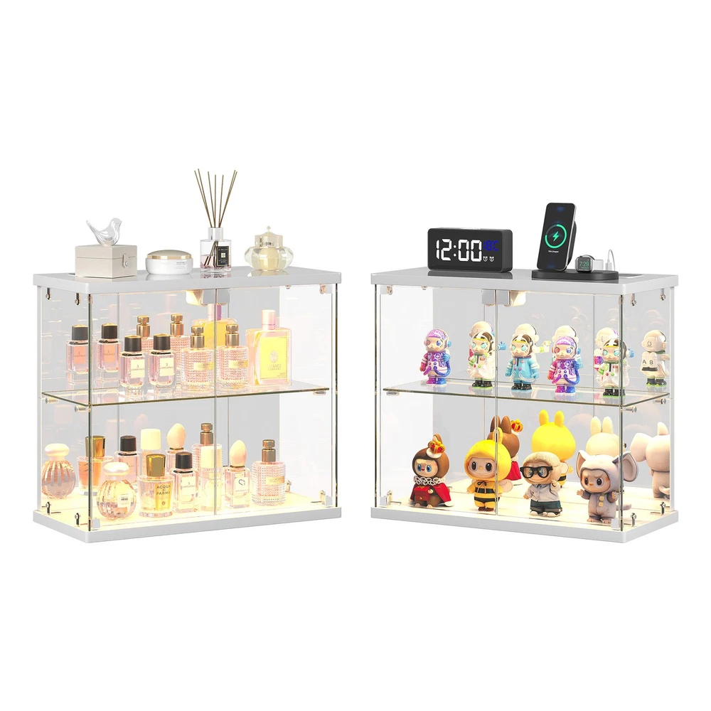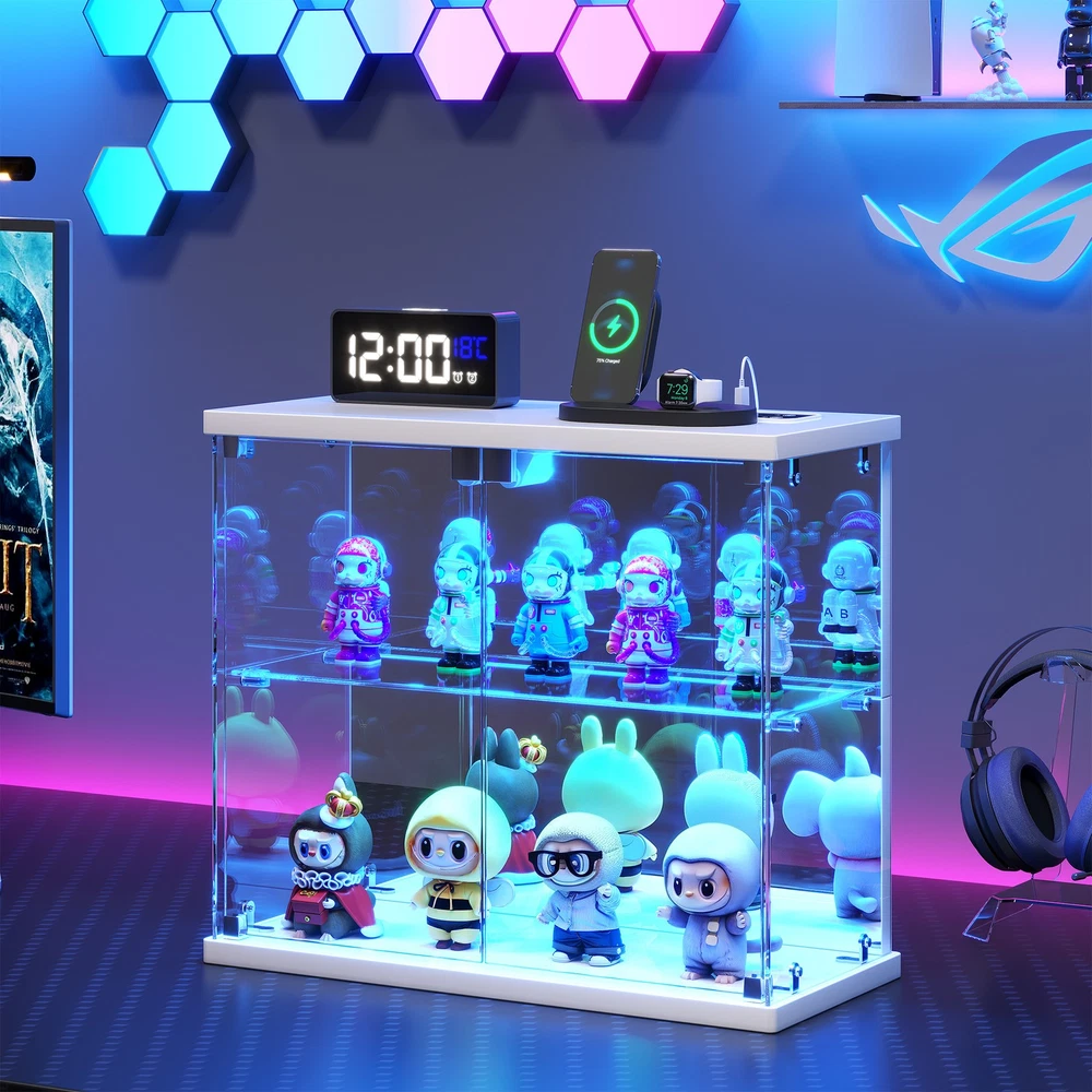 Clear Glass Display Case with LED Lights and Charging Station for Figures, White