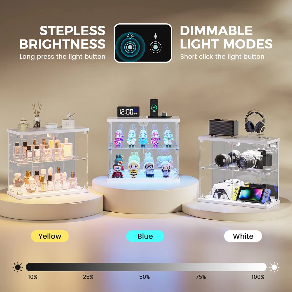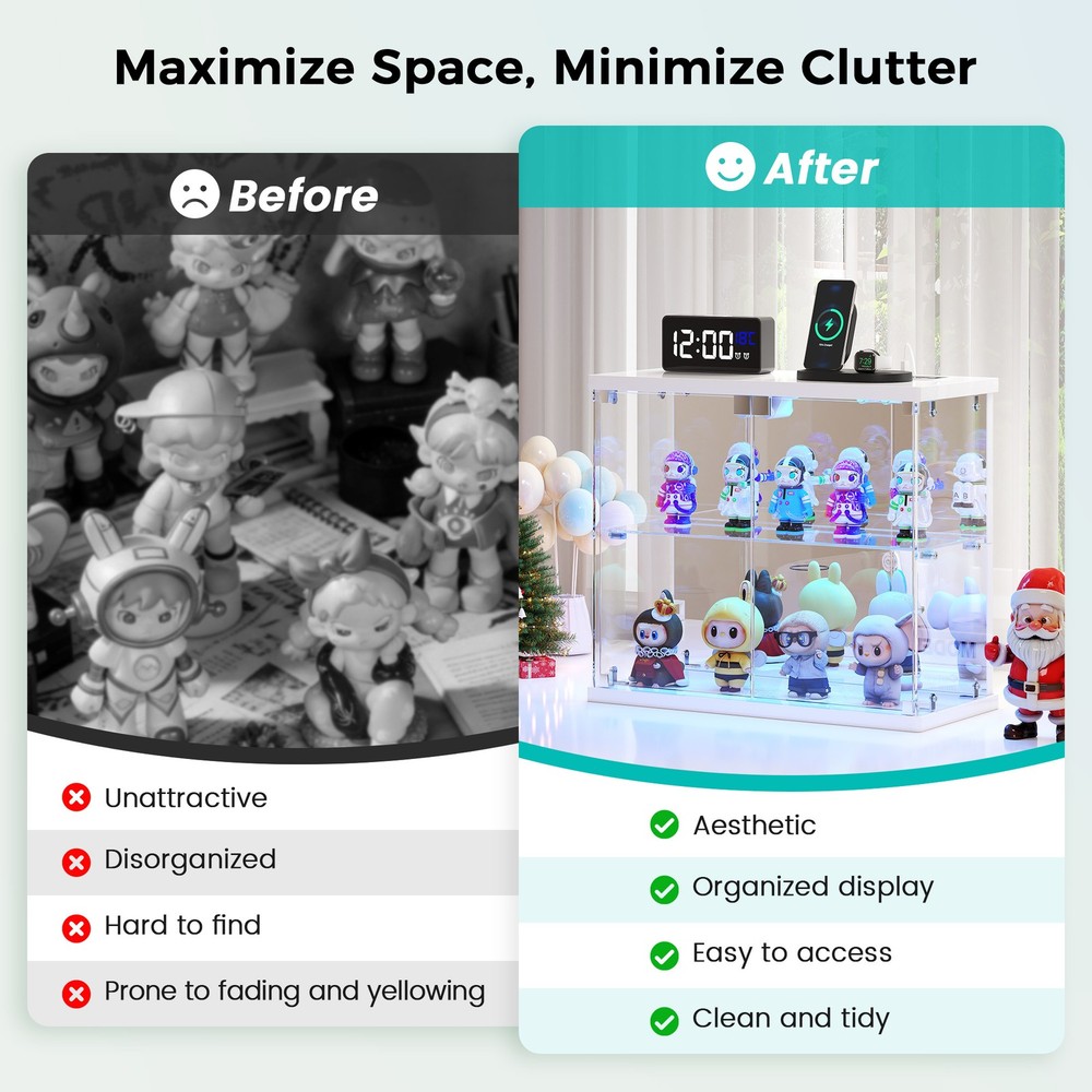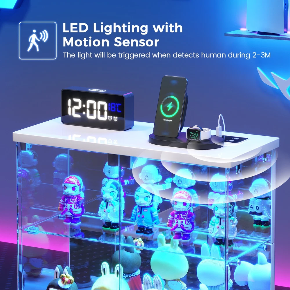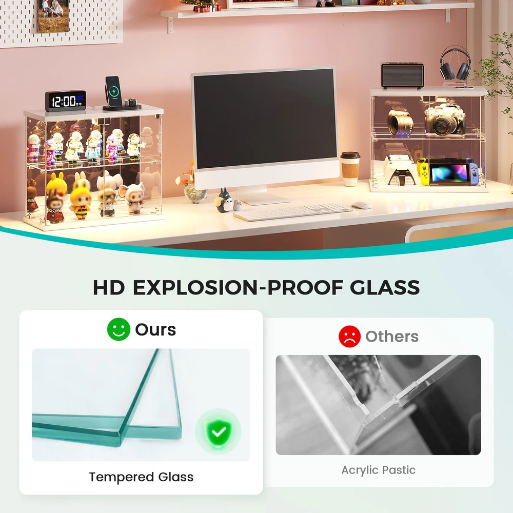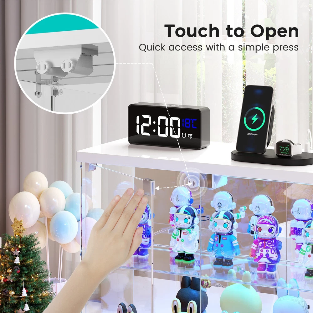 Magnetic Door with Safe Tempered – Featuring a press-to-open design, you can easily access your items with just a gentle push. This display box utilizes explosion-proof tempered glass is both crystal clear and safe. It effectively dustproofs and yellowing resistance that let your small Lego displays, perfumes, toys, or décor can be completely visible Light Control Module with Motion Sensing - This smart showcase upgrades your collection display with built-in LED lights(white, yellow, blue). The human sensor automatically switches the lights on when you approach within 1 meter, and turns them off after 30 seconds, achieving both energy efficiency and a stunning visual display Integrated Charger Station – This display organizer comes equipped with a built-in Type-C and a USB port, enabling simultaneous charging for two devices. Conveniently power your phone, tablet, earbuds, or smartwatch without the need for extra adapters. Keep your essentials fully charged overnight while maintaining a clean, cable-free display surface Mirrored Back Panel – With a mirrored back, this glass display case reflects your collectible figurines, visually expanding the space and adding remarkable depth to each piece. Not only does it brighten the entire display, but it also turns any ordinary space into a dynamic and eye-catching part of your bedroom Easy Assembly with Clear Instructions – Each panel is clearly labeled, and detailed step-by-step guides will walk you through the process. For optimal ease, using power tools is better. Enjoy a creative hour of assembly as a rewarding project with your partner or family Our product frames are all made of FSC-certified wood Lighting for Your Display harge Hub for Your Desk Tempered Glass: Why It’s Clearly Better Gifts to Display & Delight