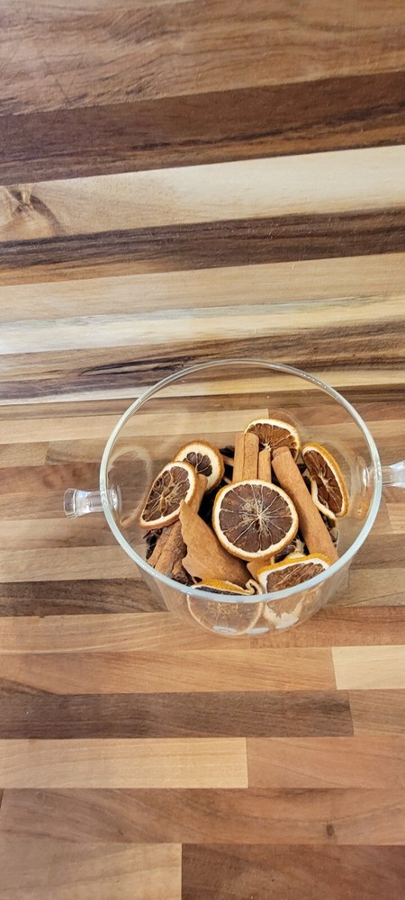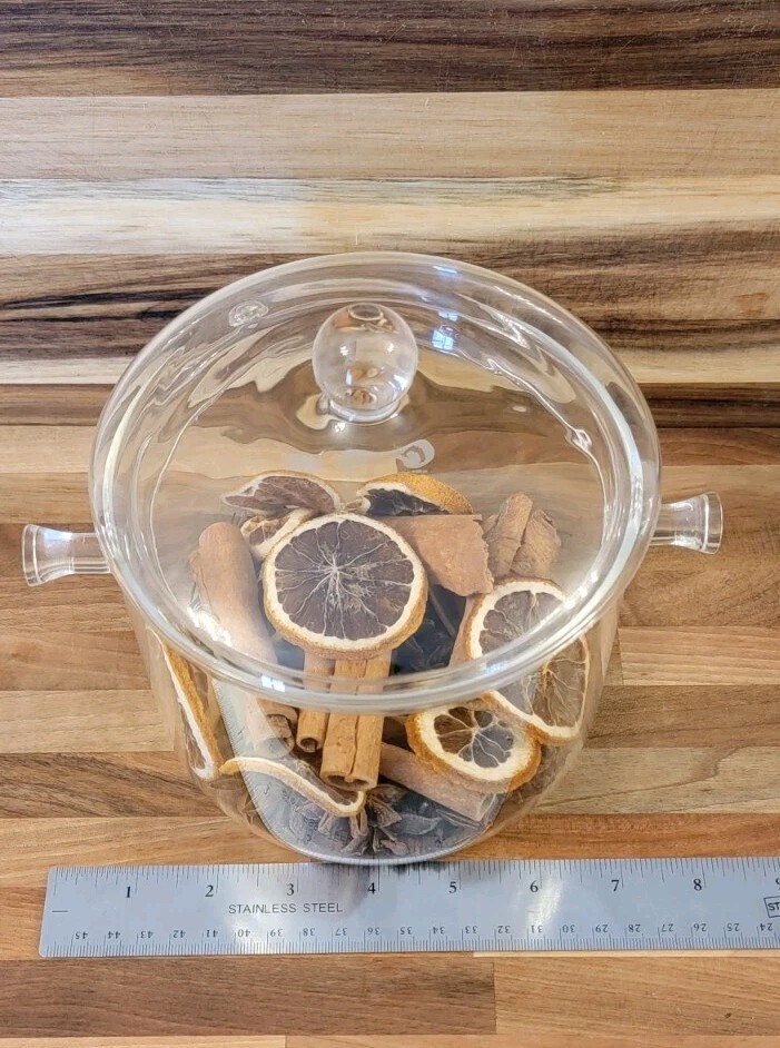 Never used. Clear Glass simmer pot with vented lid. Also has dried simmer mix in the pot for one use. Photos are part of the listing description. All items come from a smoke-free environment, are handled with care, and shipped within 1 business day! Message us if you have any questions and/or want additional photos. Thank you for visiting! Please check out our store for other items. We are happy to bundle items for discounted shipping!