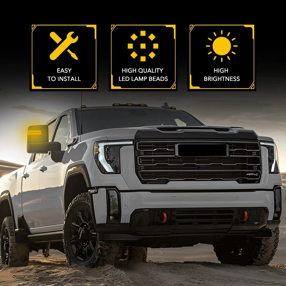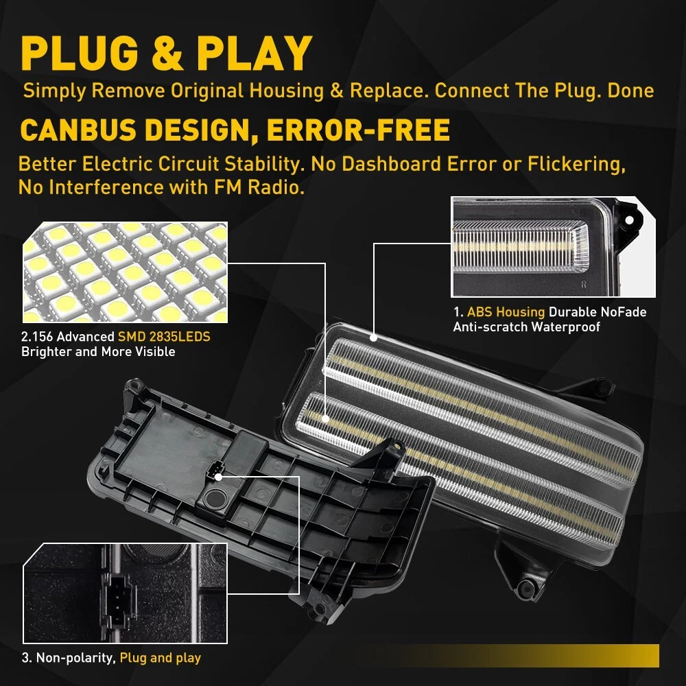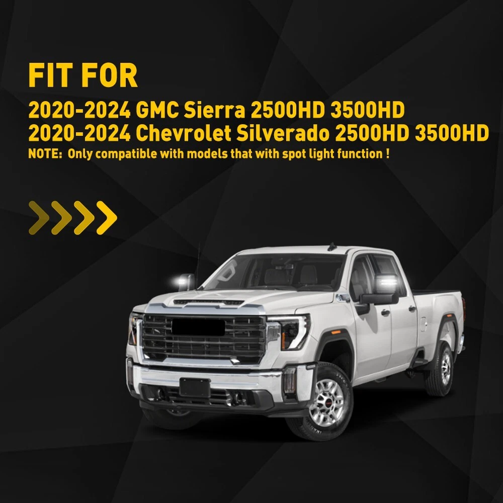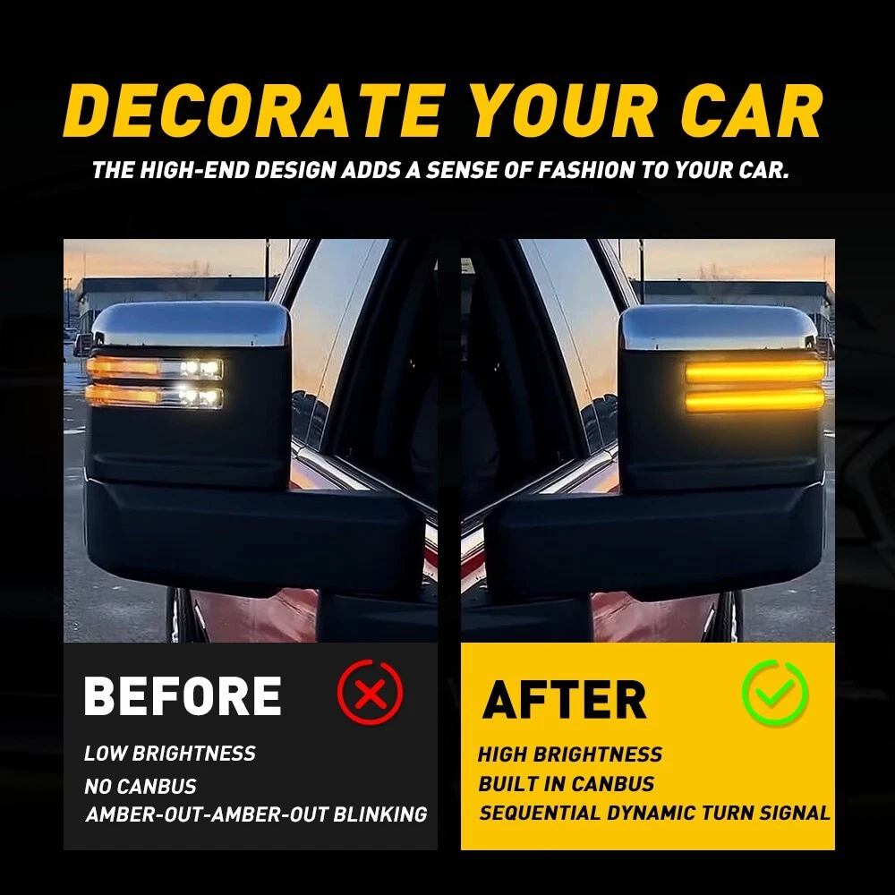 Feature: *Durable Made of superior material with high durability and impact-resistance to extend its long service life and a better shopping experience for our customer. *Simple installation Easy installation with direct replacement, other modifications are not required. *High brightness Adopts excellent LED beads with high brightness to improve its visibility, it is more bright than the old one. *Note Please confirm your car model before purchasing for matching your vehicle perfectly!! Specification: OE锛 Right: 84468926,84468924 Left:84468927,84468925 Lens color:Clear Mode: normal lighting(white) Clear LED Switchback Side View Mirror Turn Signal Light For 2020-2024 GMC Sierra Feature: *Durable Made of superior material with high durability and impact-resistance to extend its long service life and a better shopping experience for our customer. *Simple installation Easy installation with direct replacement, other modifications are not required. *High brightness Adopts excellent LED beads with high brightness to improve its visibility, it is more bright than the old one. *Note Please confirm your car model before purchasing for matching your vehicle perfectly!! Specification: OE锛 Right: 84468926,84468924 Left:84468927,84468925 Lens color:Clear Mode: normal lighting(white) dynamic lighting(amber) Waterproof grade:IP67 Service life:50000h+ Fits for: 2020-2024 GMC Sierra 2500HD 3500HD 2020-2024 Chevrolet Silverado 2500HD 3500HD NOTE: Only compatible with models that with spot light function! Package include: Side Mirror Signal Light Housings*2 What makes you choose our products? 1. Rapid logistics and response We will dispatch your order within 24 hours since your payment to guarantee that you can receive your order immediately. 2. High quality The raw materials are strictly inspected high-quality ones. In addition, our inspectors will inspect all the products again before they are dispatched to guarantee all customers receive good products. 3. Guaranteed after sales service We provide quality guarantee services ranging from 6 months to 10 years. Any customer can contact us for any problem during the period. We provide after sales services around the clock (7 x 24h). 4. High cost performance Providing products with high cost performance is our lasting objective. Our products may not be the cheapest or expensive ones, but they must be the ones with the optimal cost performance. In general,you can enjoy reliable quality, speedy service along with competitive price. Your satisfaction is my goal.My customer service is not only the guarantee of money,but also the guarantee for your time and expectation. Item Specifics Mounting Style Plug and Play LED Light Color Sequential Amber&White Color Temperature 6000K Fitment Type Direct Replacement Superseded Part Number 2020 2021 2022 2023 2024 20 21 22 23 24 GMC Sierra 2500HD 3500HD Certification DOT, SAE, E4, CE Placement on Vehicle Left Brand AUXITO Type Turn Signal Light Assembly Interchange Part Number Driver Passenger Left Right LED Side Mirror Light Manufacturer Warranty 2 Years OE/OEM Part Number LED Sequential Amber Turn Signal Light Lamp Voltage 12 V Housing Color Black Lens Color Clear Lighting Technology LED Manufacturer Part Number 84468926, 84468924, 84468927, 84468925 FAQ Why swith to LED? LEDs not only give your vehicle a clean, modern look but, with proper use, will outlast any halogen bulb and HID bulb! Low energy draw, high lumen output, and instant on/off LED technology out shines stock bulbs in every way. Which bulbs are used in my vehicle? Check Sylvania automotive lamp replacemnt guide , you can select the year, make, and model of your vehicle, then select the application you want to replace or upgrade from stock. What does CAN Bus mean? CAN Bus means Controller Area Network Bus. This system monitors your vehicle and reports operating conditions. CAN Bus systems are commonly found in European vehicles such as BMW, Audi, Mercedes, Volkswagen, Porsche, and in many American vehicles. While most late model American vehicles have CAN Bus systems, it is always good to check with your vehicle dealer to see which system your vehicle has before purchasing electrical products. When do you need Warning Canceller? Some vehicles with cmplex internal computers(such as Audi,BMW,Jaguar,Mercedes,etc.) might report on-dash errors or flickering on the headlights. The warning canceller fixes the dashboard warning and flickering effect. Bulb Out Dashboard Error: On some vehicles, the dashboard will report as if you have a headlight bulb missing or burnt. It does not affect the headlights functioning, but the light on-dash will be on. The warning canceller fixes the issue. Flickering Issue: This happens when your vehicle does not recognize the new headlights installed. When turning the headlights on, the vehicle's computer does not understand the signal back from the headlights hence thinking they are still off. This triggers the headlight flickering effect. The warning canceller solves this issue. LED Advantages: Very low and efficient energy consumption than halogen bulbs & HID Bulbs Compared with HID bulbs, LED bulbs Light up instantly, no warm up period Low voltage protection, high precision constant current driver chip Longer lifespan than HID and halogen bulbs Light can be controlled easily in color and intensity Easy to install a LED headlight conversion kit Shipping (1) We will ship your item(s) within 48 hours. (2) We ship this item to US only via USPS first class mail. It usually takes 3-6 working days to deliver. Returns How Long Will It Take to Receive My Refund? If you have emailed us for a refund ,once we have approved it ,after 30 days your money will be refunded. The estimated time for the refund to appear in your account is based on the payment method you use. Paypal is the only supported in NIGHTEYE Store. Please notify us within 30 days after you've received your purchased item. All return requests must be submitted through your eB
