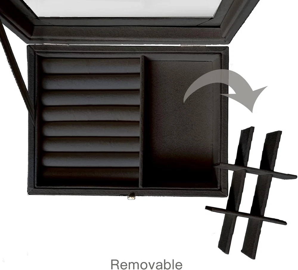 Clear Lid Velvet Jewelry Organizer Box with 9 Grids and 8 Slots 9 Grid, Black Product Details Color: Black Brand: Jemjosh Material: Acrylic Style: Modern Special Feature: Jewelry Organizer,Removable Recommended Uses For Product: Ring Product Dimensions: 8"D x 6"W x 1.9"H Target Audience: Women Shape: Rectangular Occasion: Mother's Day, Wedding, Friendship Day, New Home, Valentine's Day ATTRACTIVE DESIGN: This velvet lining jewelry case have a transparent Acrylic lid that can be clear for owner to see their jewelry and accessory. One integrated safety locks for added security, protect your rings, earrings, chain necklaces, small watches, thin bracelets and cuffs. DIMENSION and DESIGN: Compact design 8*6*1.9 inch. This jewelry organizer is composed of 8 ring slots that can hold about 30 rings, and the removable divider create 9 grid for your jewelry. CLEAR AND TIDY: Put this Jemjosh jewelry box on your dresser or in the drawer can keep your dresser in order and it's will be seldom to lost your accessory or some small things. You can storage your thing easy and clean. MULTIFUNCTION: This jewelry organizer can hold and protect your jewelry, some souvenir coins or medallions, Not only for home use but also suitable for countertop jewelry display in stores or trade shows. PERFECT GIFT: Velvet jewelry box is a great thoughtful gift for a mother, girlfriend , wife, daughter, colleague, friend or any other special woman in your life. An idea gift for Mother's day, Christmas, Birthday, Thanks Giving day and Anniversary.