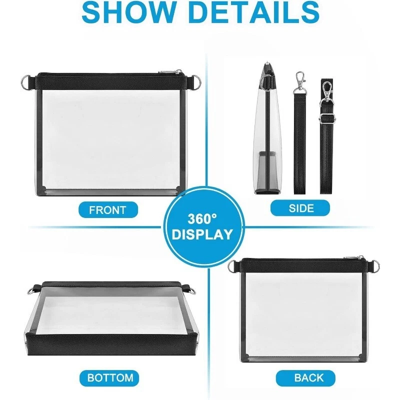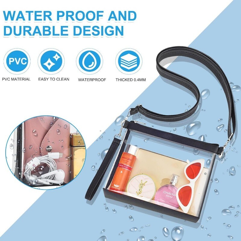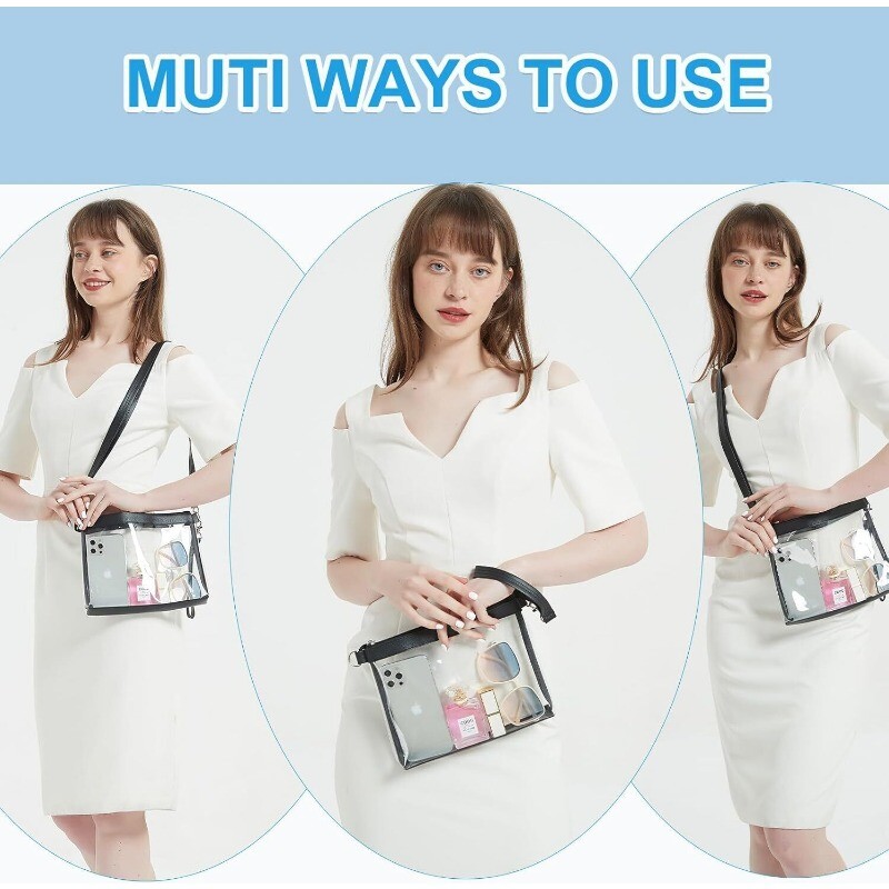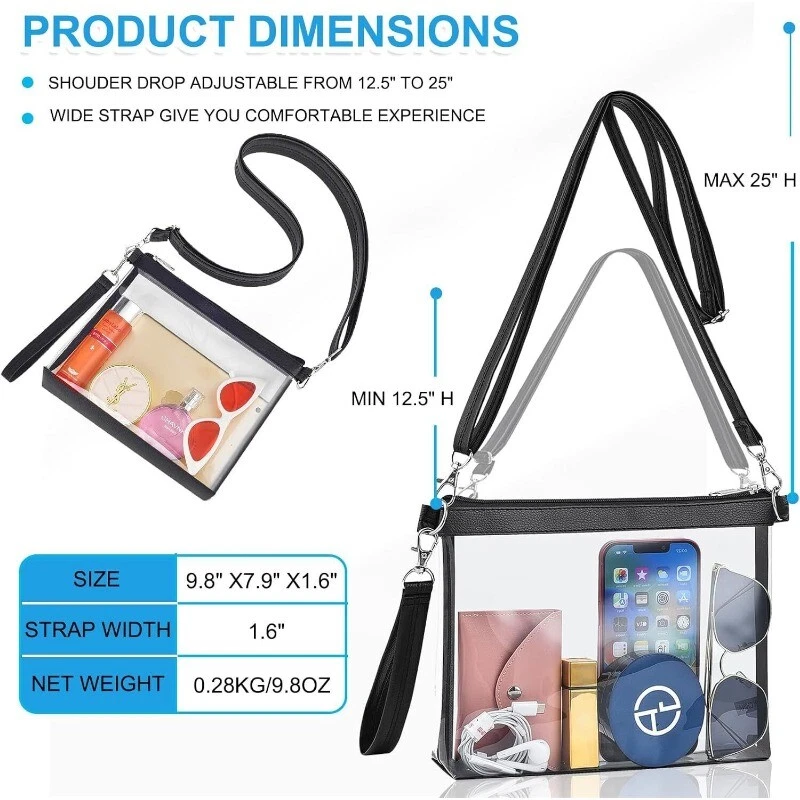 Busiuw Clear Bag Stadium Approved Weight: 260g/9.38OZ Thickness:0.4mm Size: 9in x7in x2.5in Shoulder Strap Length:25-50 inches Many stadiums and concert venues have implemented clear bag policy to enhance security for both the audience and staff, and to expedite entry into venues and stadiums. Since our clear crossbody bag is no bigger than 12x12x6 inches and complies with the clear bag policy standards, it can be approved by the stadiums and festivals . If you have this with you, you can speed through the security line and avoid the time-consuming inspection process for your belongings. A chic clear bag/purse is the ideal addition to your gorgeous tour attire, elevating your country concert outfit for ladies. Because of the purse's transparent design, you can show off your festival essentials and update your look at the same time. The clear purse is a stylish and useful addition to any concert outfit, whether you're sporting a flashy dress or a contemporary jumpsuit. NOTE: Before purchasing, please be sure to review the clear bag policy on the local stadium's official website for your event to avoid entry refusal and ensure a smooth visit to the game. Safety Warning CHOKING HAZARD -- Contains small parts, not suitable for children under 3 years old. On Sep 2, 2025 at 20:09:24 PDT, seller added the following information: